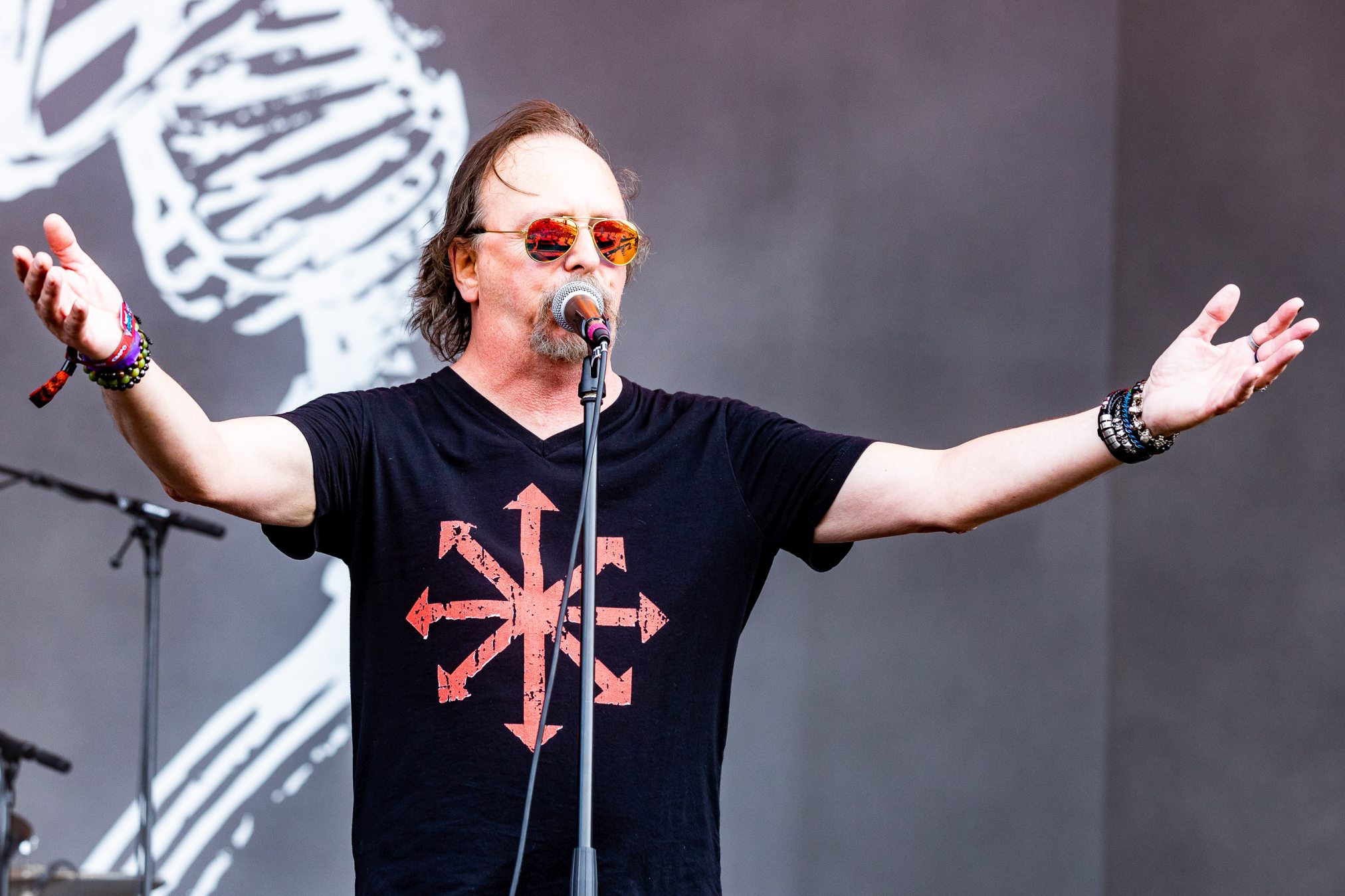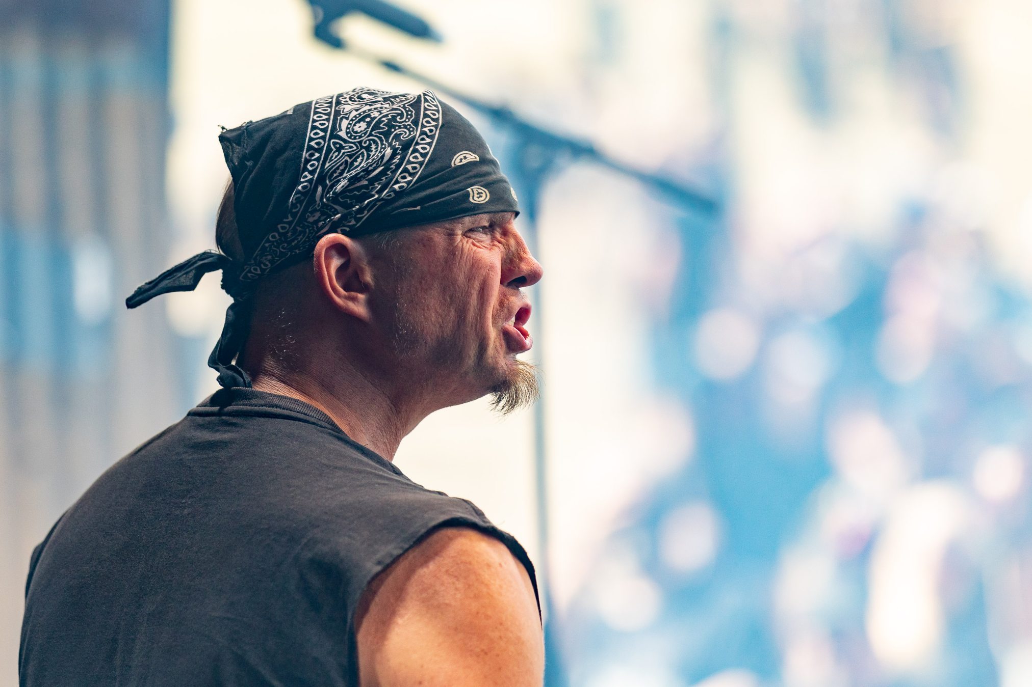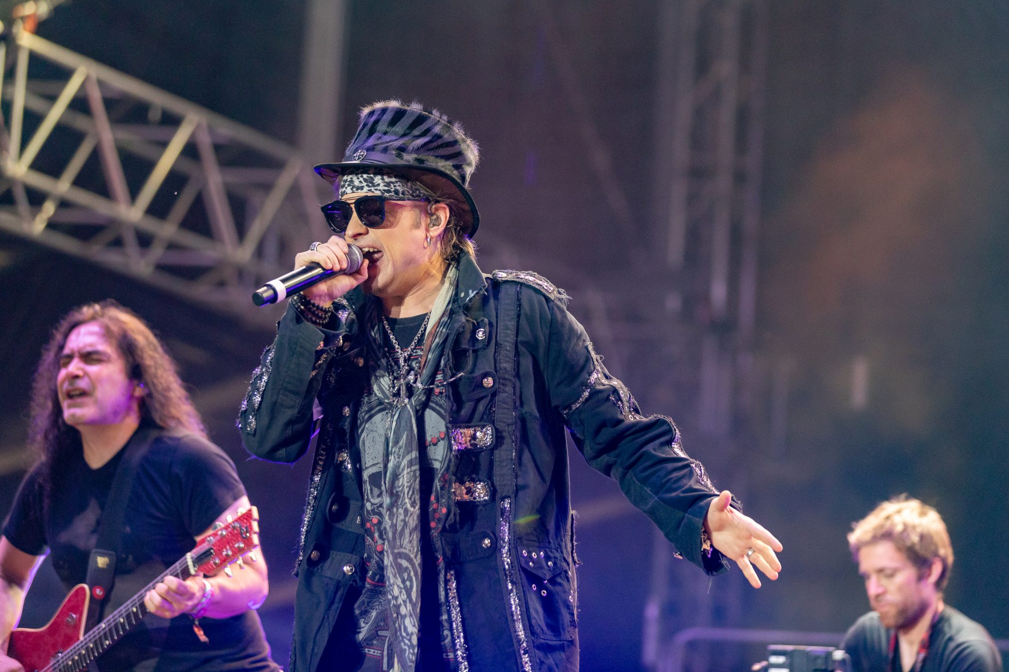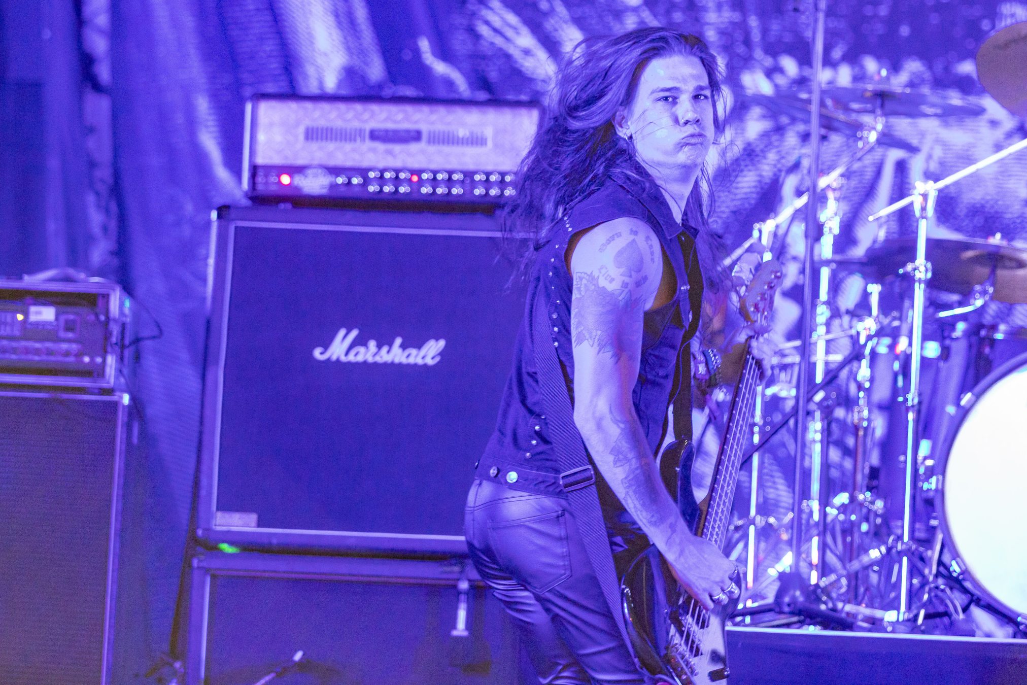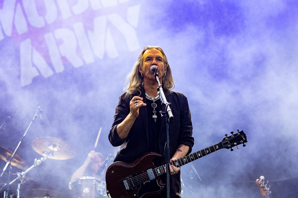 Bühne frei für das musikalische Urgestein MICHAEL MONROE. Dieser steht die nächsten 75 Minuten für Rockparty und kann voll mit seiner Mixtur aus Glam-, Punk- und Bluesrock überzeugen. Der finnische Sänger ist glamourös und beherrscht die Bühne in seinem zarten Alter von nunmehr fast 60 Jahren mühelos. Neben seiner überzeugenden Stimme springt er vom Lautsprecherturm, bringt mehrere Spagate ein, um musikalisch dann wie nebenläufig mit Mundharmonika und Saxophon zu überzeugen. Selten haben wir einen so schillernden Frontmann gesehen und kann nun verstehen, wie Projekte mit Guns‘N‘Roses entstanden sind. Auf der persönlichen Ebene bleibt ihm zu wünschen, dass die Transgender-Bewegung dazu beigetragen hat, dass er als Mann mit einem Faible fürs Schminken, weniger Abneigung erfährt.