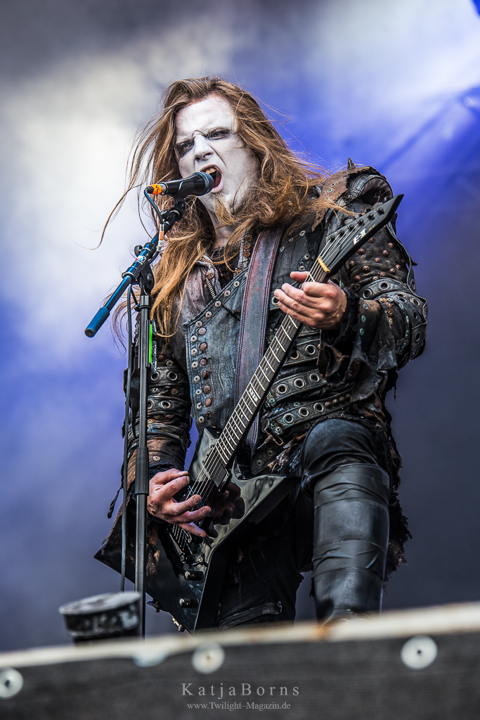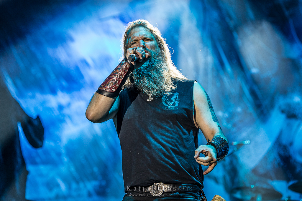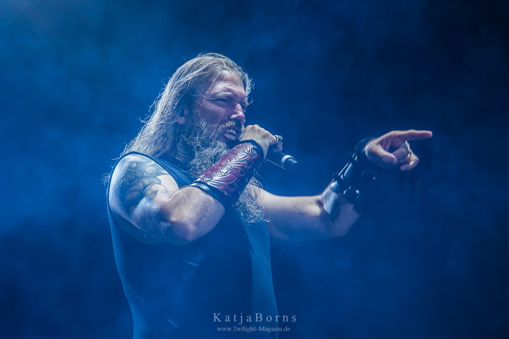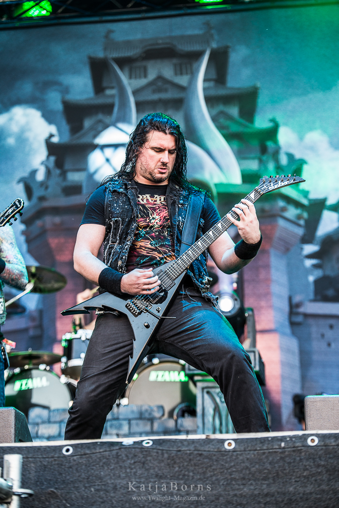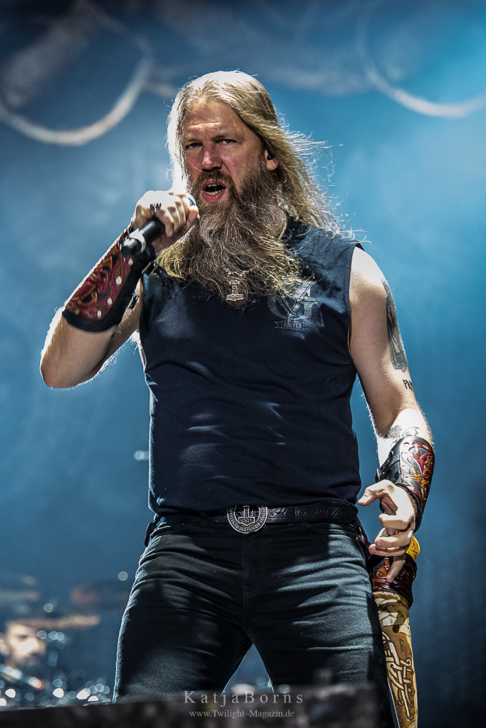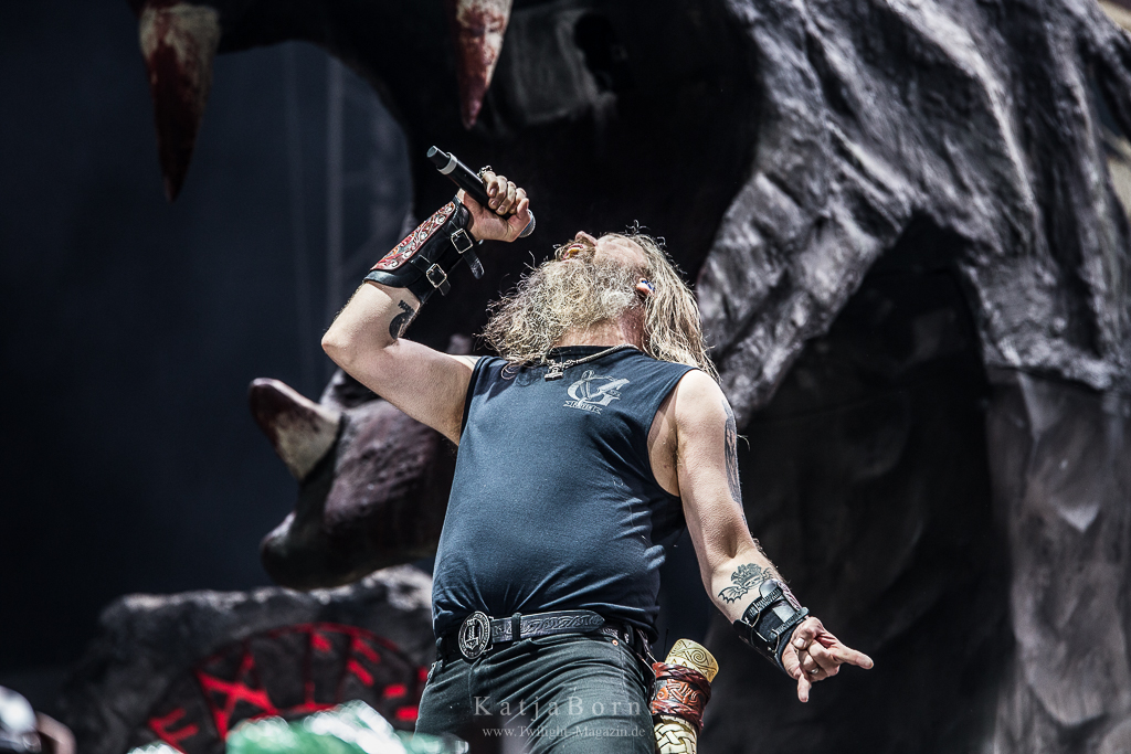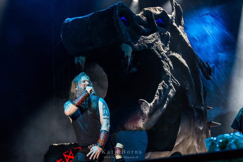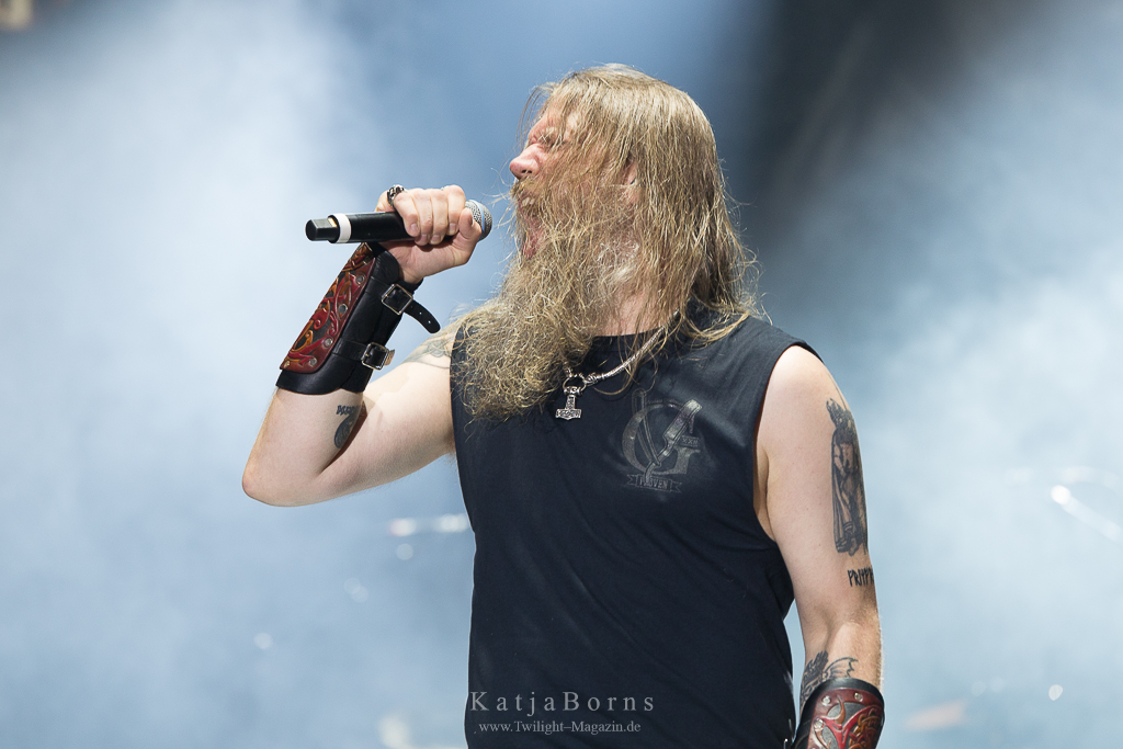 Die Verlängerung und das Elfmeterschießen waren vermutlich eine arge Geduldsprobe für den Headliner, der mit seinem Auftritt auf das Ende des Fußballspiels warten musst. Durch das Ergebnis war allerdings beste Stimmung auf dem Platz, als sich aus viel Rauch und bunten Lichtern zwei Drachenköpfe erhoben und das Erscheinen der nordischen Berserker ankündigte. AMON AMARTH eröffnete auch gleich mit einem Klassiker und das bekannte Riff aus „The Pursuit of Vikings“ erlaubte es uns zahlreich anwesenden Zuschauern sofort wieder vom Fußball- in den Metal-Mod