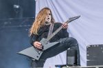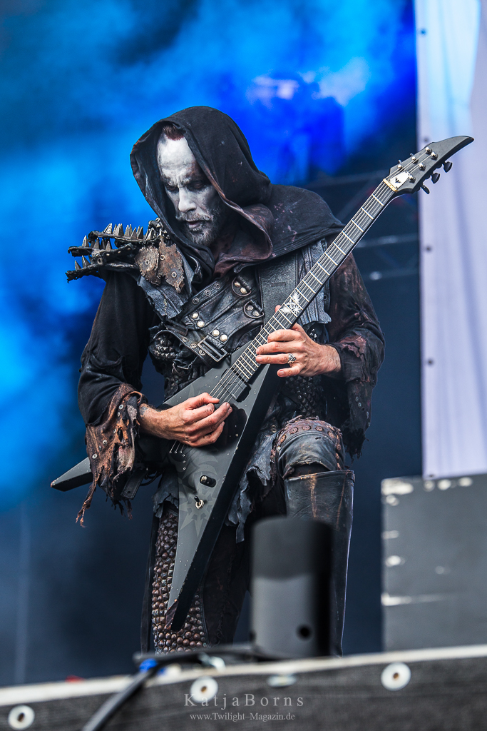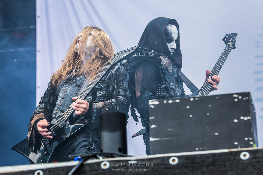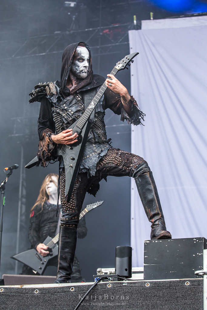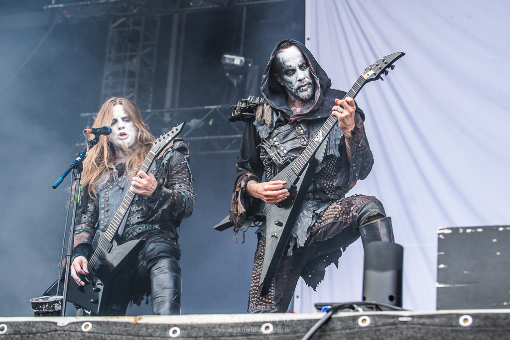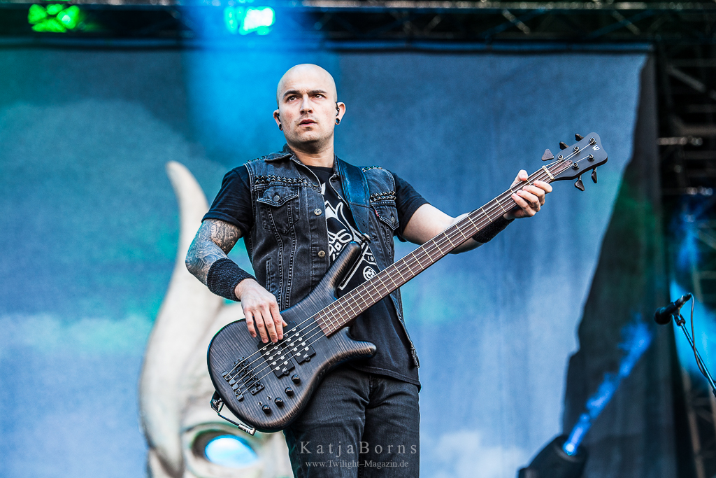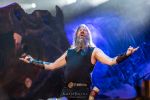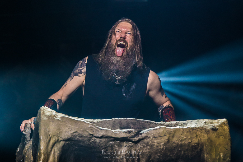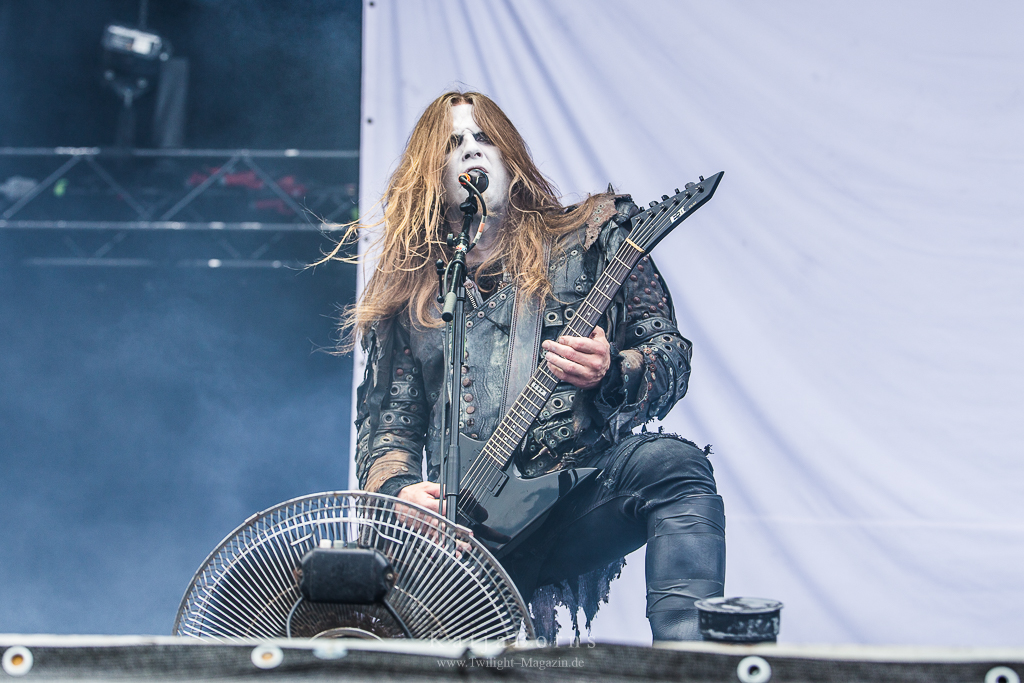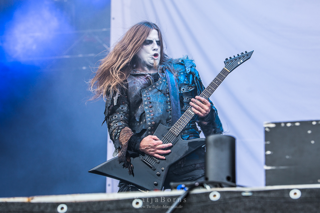 Die Verlängerung und das Elfmeterschießen waren vermutlich eine arge Geduldsprobe für den Headliner, der mit seinem Auftritt auf das Ende des Fußballspiels warten musst. Durch das Ergebnis war allerdings beste Stimmung auf dem Platz, als sich aus viel Rauch und bunten Lichtern zwei Drachenköpfe erhoben und das Erscheinen der nordischen Berserker ankündigte. AMON AMARTH eröffnete auch gleich mit einem Klassiker und das bekannte Riff aus „The Pursuit of Vikings“ erlaubte es uns zahlreich anwesenden Zuschauern sofort wieder vom Fußball- in den Metal-Mod