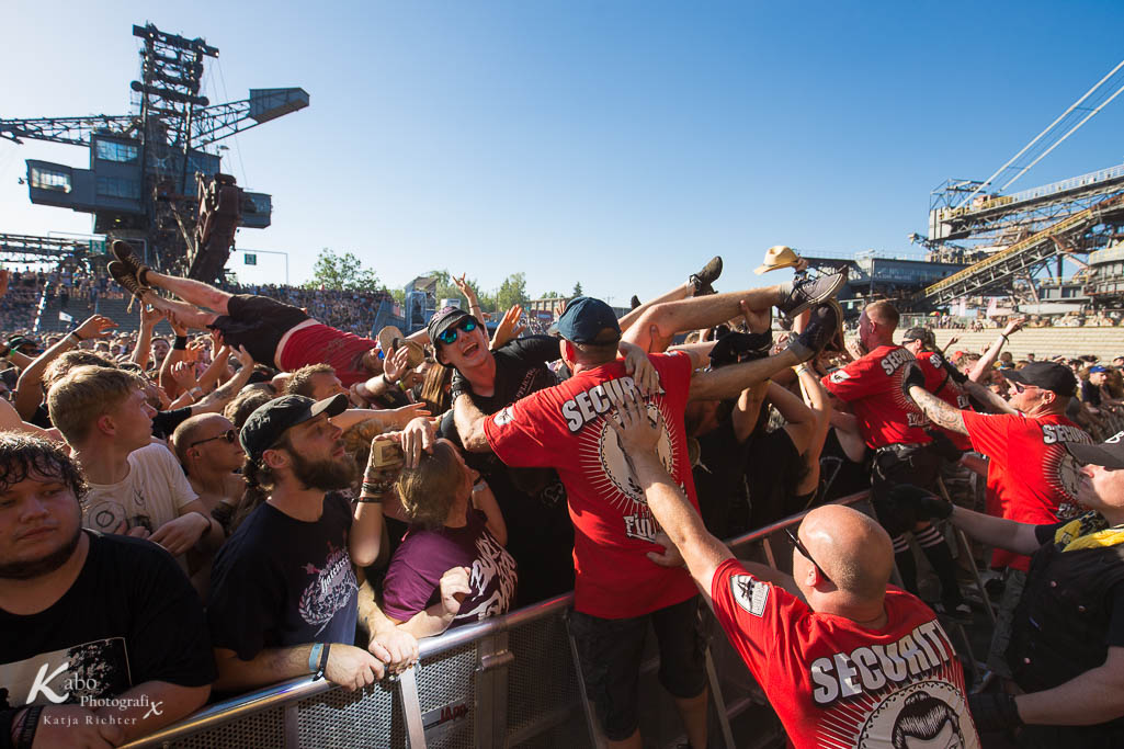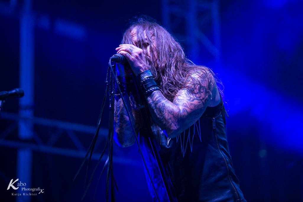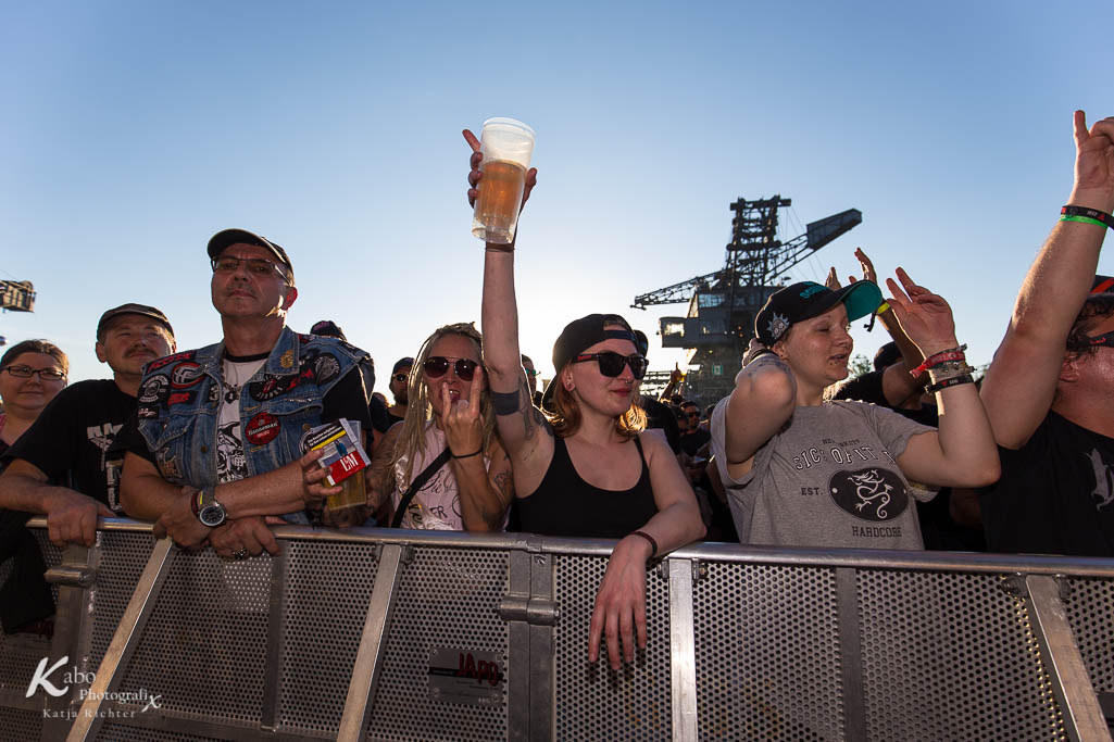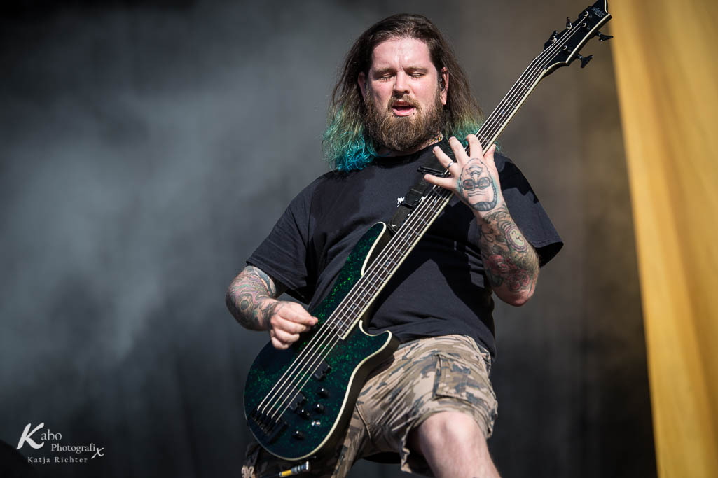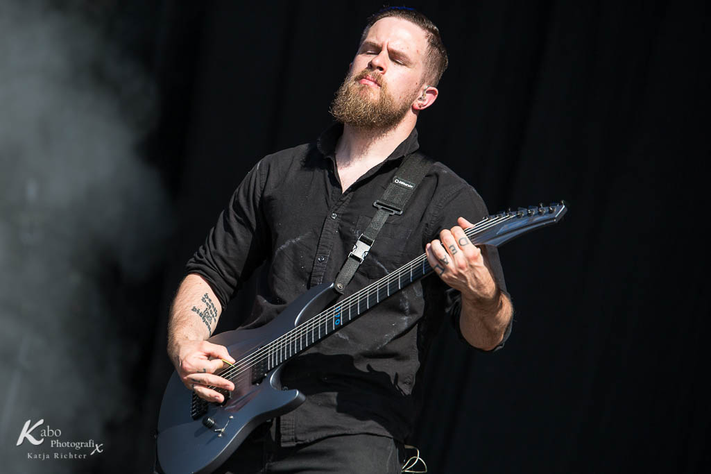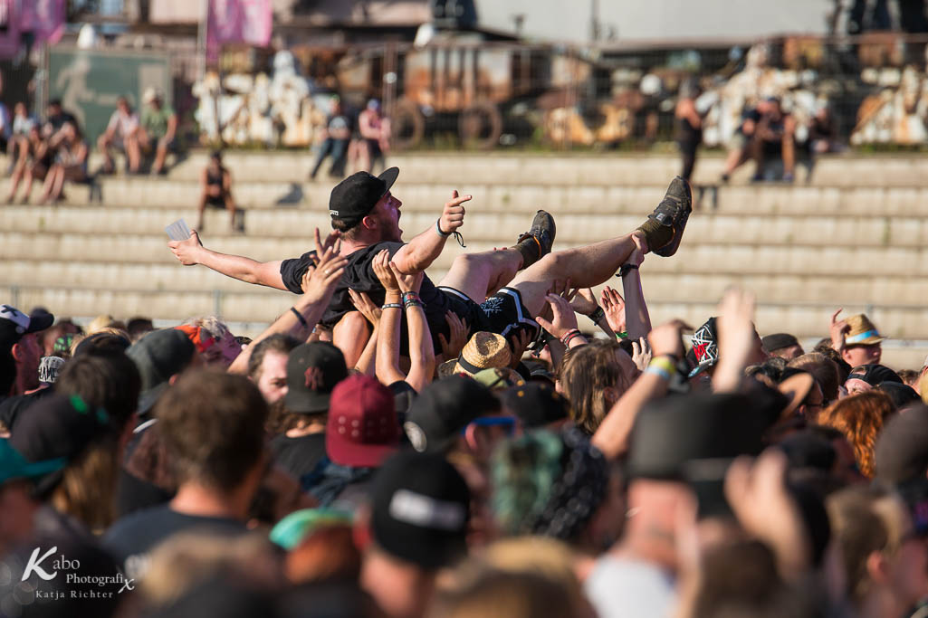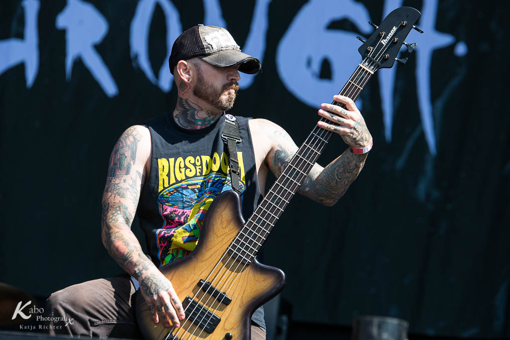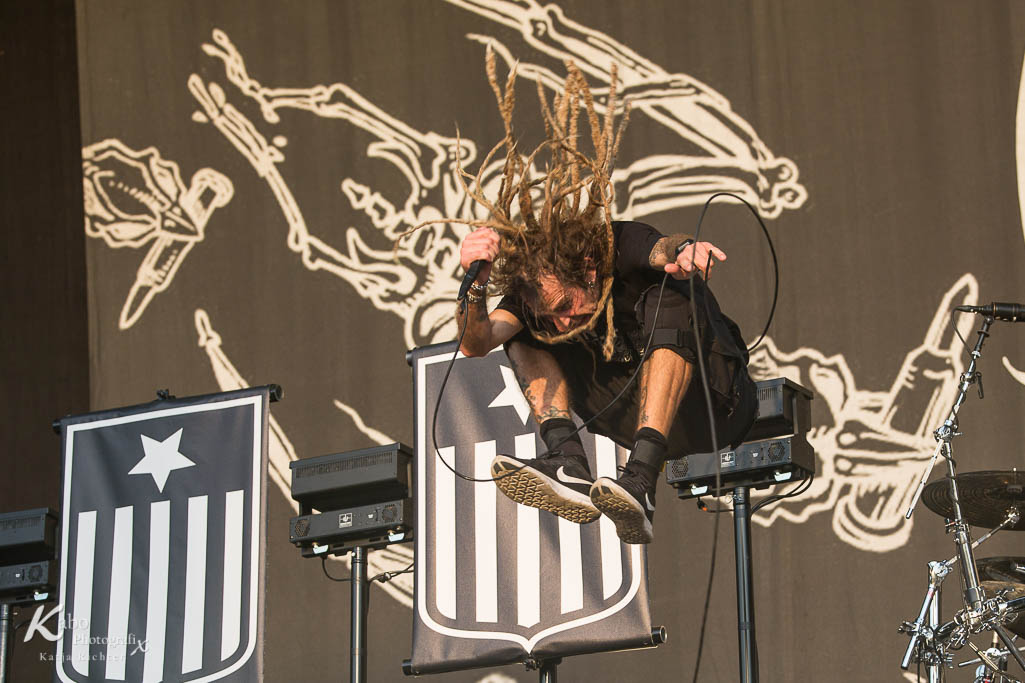 Samstag – Geweckt von der großen hellen Scheibe, die viel zu früh und viel zu stark am Himmel stand, musste der Kreislauf nun erstmal langsam hochfahren und sich an das Wochenende gewöhnen – man sind wir alt geworden! Für CROWBAR haben wir uns dann doch irgendwann zum Festivalgelände geschleppt und mit Kirk in der Hitze gelitten. Die Hauptbühne ist für die Truppe aus Louisiana definitiv angemessen, nur leider fand sich das Publikum hier nur spärlich zusammen. Dennoch gelang es den Amis spielend leicht, die anwesenden, vor Hitze brütenden Gehirne, in ein sludgiges Doom-Parallel-Universum zu kicken. Zu den schweren Riffs und Rhythmen will schließlich mitgebangt werden und Songs wie “All I had I gave” oder “Planets Collide” laden auch wunderbar zum Mitgröhlen ein. Weiter ging es mit INFECTED RAIN auf der Seebühne und JINJER im Hardbowl – beide stark und irgendwie passend auf ihren Bühnen. Jinjer Fronfrau Tatiana Shmaylyuk nahm in ihrem schrill goldenen Outfit und ihrer unfassbaren Energie sogleich die Bühne in Besitz und sollte sie für den Rest des Auftritts auch nicht wieder hergeben. Passender hätte “Dying in heat is a rehearsel for being in hell” an diesem Tag nicht sein können!