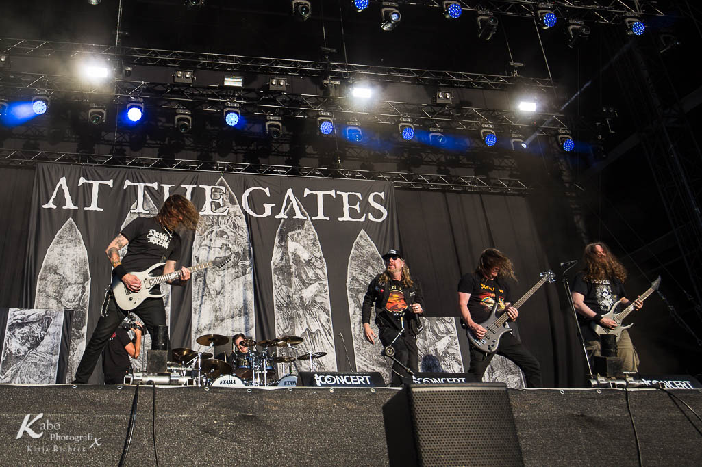 Dennoch peitschte Jinjer ihr fanreiches Publikum gnadenlos weiter nach vorn und mit damönischer Präsenz geradewegs ins Metal-Fegefeuer. Bei AT THE GATES und KNORKATOR auf der Mad Max Stage war es dann wieder vorbei mit Schonhaltung und es durften alle Muskeln strapaziert werden. Mit ihrem melodischen Death Metal, der keine Ermüdungserscheinungen und keine moderne Sänfte an den Tag legt, haben sich At the Gates um ihren Legendenstatus verdient gemacht. Tompa Lindberg, mit seinem mittlerweile zum Markenzeichen gewordenen Look im Cappy, ist in stimmlicher Bestform und führt gekonnt durch das Set, das sich die Waage aus Klassikern und neuem Material hält. Bereits der Bühnenaufbau von KNORKATOR ließ auf einiges hoffen. Grundsätzlich gehören die Auftritte von Knorkator zum Full Force wie die Erdbeerbowle. Wo andere Bands Balsam für den Körper sind, sind Knorkator purer Urlaub für die Synapsen. Als Verstärkung holte man sich aus Österreich zwei vollkommen durchgeknallte Vögel, die unter dem Namen dummeSau.lol für allerlei Schabernack sorgten. Anscheinend boten sie Ersatz für den am Knie verletzten Stumpen, und so wurde von Leitern auf Tapezier-Tische gedivet, mit einem Gummistiefel an einer Wippe dem Gegenüber mit ordentlich Schmackes ins Gemächt getreten oder mit einer Pümpelkanone aufeinander geschossen. Auch vor den eigenen Tourmitgliedern wurde nicht Halt gemacht und so wurde das diesjährig auserwählte Opfer in einen großen Plexiglas-Kasten gesteckt, in dem dann via Fernzündung eine riesige Schwarzwälder-Kirsch-Torte explodierte. Aber das FullForce-Publikum wäre nicht das FullForce-Publikum, wenn es diesen Mann anschließend nicht ehrenvoll beim crowdsurfen wieder sauber geleckt hätte. Neben den eigenen Kindern gehörte diesmal auch Kumpel RUMMELSNUFF zur Bühnenshow, der eine sehr klare und verständliche Version von “Mich verfolgt meine eigene Scheiße” darbrachte. Abwechslung boten SMOKE BLOW mit gewohntem Live-Potential und ihrer schweißtreibenden Hardcore-Punk-Variante im Hardbowl und ALCEST mit ihren stimmungsvollen Instrumentals am Strand – was eine abgefahrene Mischung! Mit ihren dichten Klangwelten lockte der anfangs noch ziemlich leere Sandstreifen immer mehr neue Zuhörer. Auch wenn der Bass leider stark übersteuert war, ließen Alcest das Publikum in der geschaffenen Atmospshäre andächtig im nun kühler werdenden Sand träumen. Abgerundet wurde der Samstag für uns mit TERROR in der Tentstage, die alles zerlegten und die sowieso schon ausgelaugten Leiber nochmal ordentlich durch die Schwitz-Presse jagten. Kein Wunder also, dass ARCH ENEMY mit beeindruckender Bühnenkulisse und ordentlich Feuerwerk mehr entspannte „Zuschau-Unterhaltung“ boten, als Anreiz zur Bewegung.