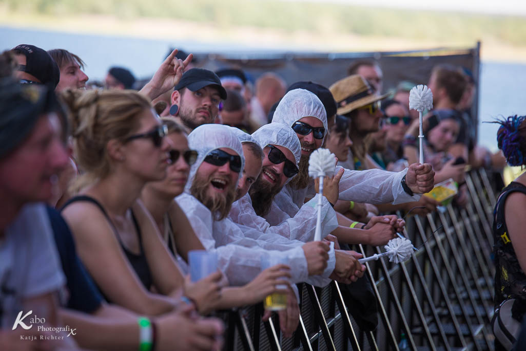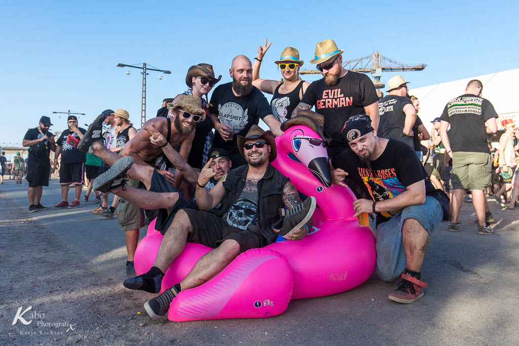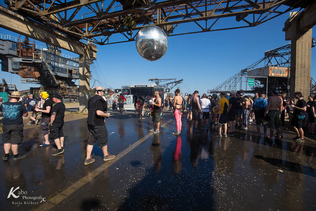 Für das leibliche Wohl sorgten wieder verschiedene Anbieter auf der Getränke- und Fressmeile. Kulinarisch kam so gut wie jeder auf seine Kosten, ob vegan oder deftig Fleisch, und natürlich war auch in diesem Jahr wieder die allseits beliebte Erdbeerbowle am Start. Die kurzen Laufwege auf dem Festivalgelände an sich und die logistisch gut aufgestellten Bühnen waren ebenfalls ein Genuss. Vor allem die Strandbühne, welche man bequem vom Wasser aus betrachten konnte, bot Sommer-Festival-Stimmung vom Feinsten. Die Stimmung auf dem Campingplatz war auch in diesem Jahr wieder gewohnt durchgeknallt und durchgehend laut, mit Musik aus allen Genres und Sphären und Partywilligen aus den verschiedensten Ländern - für dieses gediegen abgedrehte Publikum lieben wir das Full Force!