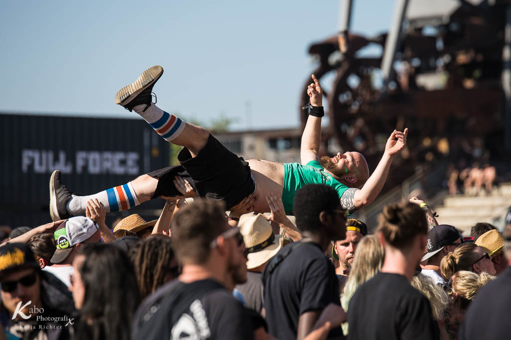 Sonntag – wir haben bis hierher überlebt, also warum jetzt schonen?! Die Hardcore-Punk-Legende IGNITE aus Orange County hatte die Stimmung und die Festivalmeute trotz der enormen Hitze gut im Griff. Die Kalifornier um Goldkehlchen Zoltán Téglás hauten praktisch einen Hit nach dem anderen raus und der energetische Sound, der brachial von der Bühne geschmettert kam, zerlegte die schwitzenden Leiber wie von selbst. Starten wir entspannt mit IGNITE auf der Hauptbühne um uns auf den nächsten Act auf unserer Liste vorzubereiten – haben wir gedacht. Was wir nicht bedacht haben – nichts und niemand bereitet dich auf GUTALAX vor – es passiert einfach. 2016 hier auf dem Festival entdeckt waren wir von Anfang an fasziniert von diesen „wilden Tschechen“ mit ihrer abgefahrenen „Bühnen-Kultur“ und ihrem ganz eigenen Verständnis von „Grindcore“. Passend platziert auf der Seebühne genossen wir die geile Mischung aus Sonne, Strand, Wasser – und eben Gutalax. Die Jungs machen ihren Job richtig gut, da kann man nix meckern, einfach Luft anhalten und genießen. Am besten sind sowieso die verstört irritierten Blicke die man kassiert, wenn man so einen „Scheiß“ am Nachmittag in brütender Hitze vom Wasser aus auch noch mitfeiert. Deutlich „humaner“ ging es bei THE OCEAN zu, welche vor allem auch musikalisch einen heftigen Kontrast boten und nochmal die Vielfältigkeit auf dem Full Force unterstrichen. Mit einem sphärischen Intro und konsequentem Stimmungsaufbau kühlten The Ocean mit ihrer Mischung aus Sludge und Progressive Metal zumindest die Gemüter etwas ab. Ganz ohne Berührungsängste warf sich dann Sänger Loic Rossetti während des dritten Songs seinen Fans entgegen und crowdsurfte ganz entspannt vor stimmungsvoller Kulisse. Lauter und aggressiver wurde es dann wieder mit BEARTOOTH auf der Hauptbühne, die ordentlich abfeuerten und nochmal alles forderten, was die Meute zu bieten hatte. Auch POWER TRIP zeigten kein Erbarmen und zerlegten die Gemeinde im Zelt, als hätte hier keiner unter den letzten Tagen gelitten. LAMB OF GOD als Einleitung in ein würdiges Finale der 26. Ausgabe vom „härtesten Acker der Welt“ ließen uns dann doch wieder melancholisch werden – letzter Tag, morgen geht´s nach Hause, also nochmal genießen! Ebenso auf diesem Festival entdeckt haben wir vor Jahren MANTAR, damals noch auf dem alten Gelände in Roitzschjora, am frühen Nachmittag bei brütender Hitze auf den schmelzenden Gummimatten vor der Mainstage, haben sie uns damals komplett den Kopf abgerissen. Diesmal, abends auf der Bühne am See, haben sie uns in scheiß-gemütlicher Strandatmosphäre einfach die Energie ins Hirn zurückgeblasen, die wir die Tage zuvor abgelassen hatten –