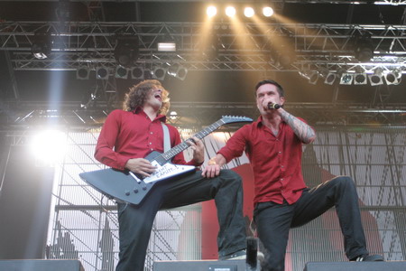 Samstags auf die Mainstage. Für mich, und ich nehme an, für viele andere auch, waren die Deutschen die eigentlichen Headliner des Abends. Wie so viele andere Band spielten auch HSB nicht zum ersten Mal auf einer WFF Bühne. Bereits 2006 zeigten die Thüringer, dass Jung und Alt zu ihren Klängen eine ordentliche Wall of Death zustande bringen können. Inzwischen haben sich Heaven Shall Burn einen Namen in der Metalcore-Szene gemacht und vielleicht haben ja auch die vergangenen Force-Auftritte einen Beitrag zu ihrem Erfolg beigesteuert. Auf jeden Fall geben sich die Musiker um Marcus Bischoff nicht mit Mittelmaß zufrieden. Mit der im Frühjahr veröffentlichten Platte „Invictus (Iconoclast III)“ haben sie die Latte, was hammerharte und doch eingängige Songs angeht, ziemlich hoch gehängt und auch live geht’s bei der Band einfach nur ab. Immerhin wird ihnen für ihren Auftritt auf dem lautesten Acker der Welt der größte Circle Pit weltweit nachgesagt. Nicht schlecht, überzeugt euch selbst auf http://www.youtube.com/watch?v=xxVJG9ZJvxE&feature=player_embedded . Wenn ich an diesen Gig zurückdenke, spüre ich noch immer das Adrenalin in meinen Venen. Heaven Shall Burn sind für mich bestes Beispiel absolut aggressiver Musik, die allerdings keinesfalls Aggression schürt, sondern selbige abbaut. Prädestiniert für crowdsurfing (haben zufällig genau das Mädelslied erwischt) und the biggest circlepit worlwide. Die Thüringer waren und bleiben eine gigantische Liveband, die während ihrer Shows gekonnt quer durch ihre Bandgeschichte führen. Die Thüringer waren ohne Frage eines der Highlights an diesem Wochenende. [Tanja]