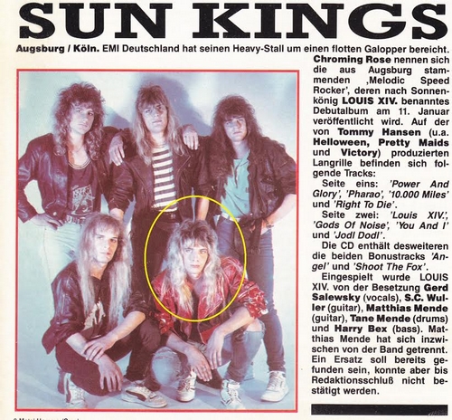 „Diese Themen hängen alle miteinander zusammen. Für die EMI sollten wir damals das Album neu aufnehmen. Ich wollte den Produzenten Tommy Hansen, der die beiden Keeper-Scheiben von HELLOWEEN produziert hatte. Da unsere Musik wegen der offensichtlich gleichen musikalischen Roots und Flexibilität beim Komponieren, der Musik von HELLOWEEN ähnelte, war das nur vernünftig. Wir testeten vorher Pete Hinton (SAXON und CORONER), aber wir haben im Prinzip nur ständig mit ihm gesoffen, sodass musikalisch da nichts Vernünftiges herauskam. Die Zusammenarbeit mir Tommy war wirklich großartig. Auch menschlich ist er echt in Ordnung. Wuller spielte damals nicht viele Gitarrenparts ein, weil er noch sehr hölzern und steril das Brett bearbeitete. So hat er “Power and Glory“, “Angel“ und “10000 Miles“ auf der Scheibe, insbesondere die Strophen, runtergeschrubbt. Ich glaube „Power and Glory“ hat er komplett eingespielt. Dazu passte seine Art zu spielen und es ist meiner Meinung nach auch so völlig in Ordnung. Schön geradlinig und schnörkellos. Das funktioniert aber nicht bei so verspielten Nummern wie “Shoot the Fox“ oder “Louis XIV.“. Dafür waren sehr viele Gitarrenspuren nötig und es war wichtig Atmosphäre zu schaffen. Die Gitarrenspuren von “Louis XIV.“ habe ich völlig allein zusammengetackert. Genauso „“Pharao“ und „Shoot the Fox“. „Louis XIV.“ war übrigens die letzte Nummer, die ich für CHROMING ROSE geschrieben hatte. Den Großteil der Gitarrenparts auf dem Album habe ich übernommen. Ich möchte das jetzt aber nicht bis ins Detail aufdröseln. 90% ist sicherlich etwas zu hoch gegriffen, aber es war der überwiegende Teil. Ich möchte aber hier nicht die durchaus gute Arbeit von Wuller schmälern. Er war eben damals noch etwas unerfahren und nicht so virtuos wie in späteren Jahren. Leider ist nach meinem Abgang ein Video produziert worden in dem sich Rikki und Wuller einen zum Louis abturnen, obwohl sie niemals einen Note davon gespielt hatten. Sogar für Tane war das Video etwas befremdlich. Ist ja auch tatsächlich irgendwie voll die Fake-Scheiße. Das fand ich schon in dem WHITESNAKE-Video zu “Still of the night“ ekelhaft, wo Vandenberg und Campbell herumposten, obwohl John Sykes zu hören ist. So ist eben das Musikbusiness.