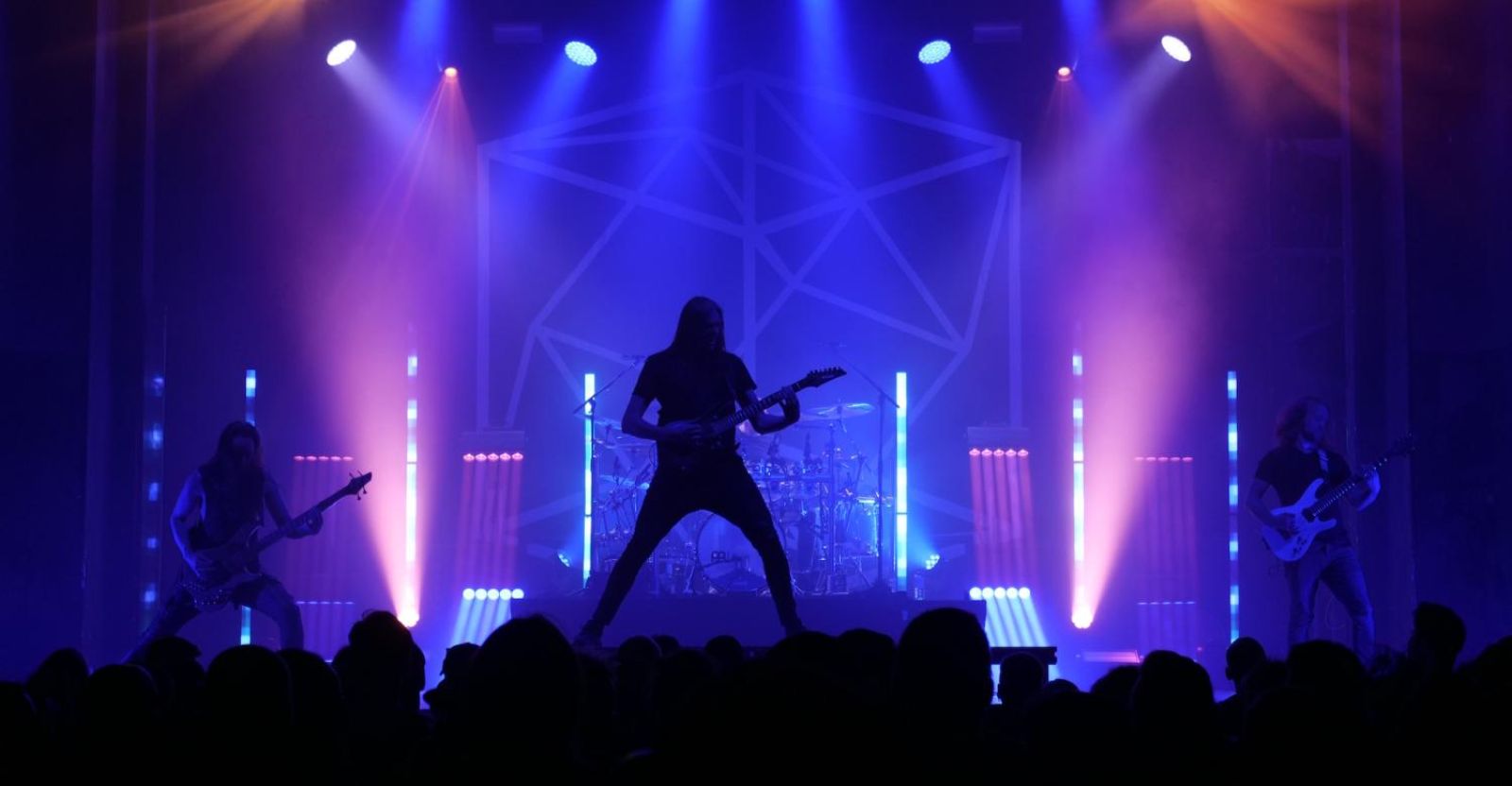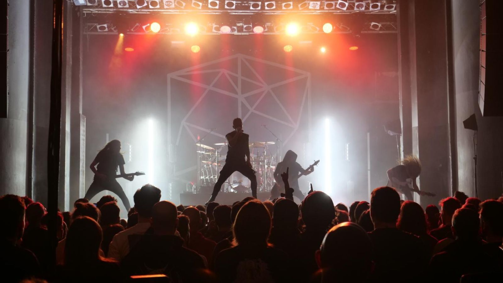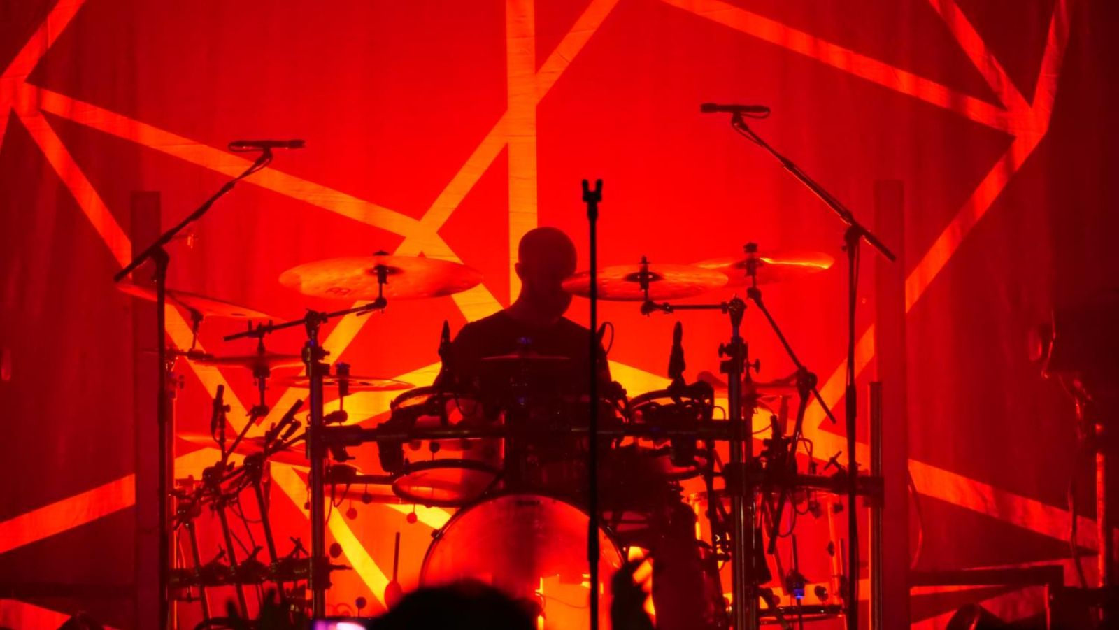 Der Umbau für den Mainact TESSSERACT dauerte eine halbe Stunde. Bühnenhintergrund war der vierdimensionale Hyperwürfel, der Tesserakt bezeichnet wird, davor mittig das Schlagzeug. Dazu Lichtsäulen/-effekte.