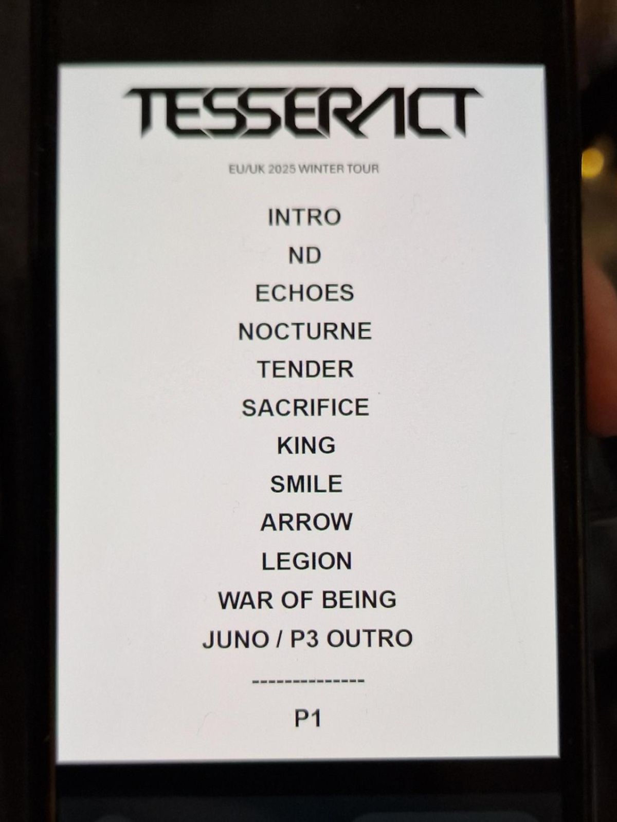 Die Setlist (ohne Intro, aber Juno und P3 zusammenfassend) umfasste mit Zugabe 12 Stücke, sechs Lieder stammen vom aktuellen Album "War Of Being" aus dem Jahr 2023 (Natural Disaster, Echoes, Tender, Sacrifice, Legion und War Of Being), vier vom Album "Sonder" aus dem Jahr 2018 (King, Smile, The Arrow, Juno), eineinhalb vom Album "One" aus dem Jahr 2011 (die Zugabe P1 und das Fragment von P3 als Abschluss von Juno am Ende des "offiziellen" Sets) und schließlich eines vom Album "Altered State", 2013 veröffentlicht, nämlich Nocturne.