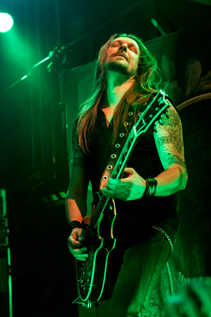 ...und ein dankbares, vor allem aber hungriges AMORPHIS-Publikum perfekt angeheizt hat. Nach kurzer Umbaupause werden die Finnen um den Freund der futuristisch-archaischen Mikrofone frenetisch empfangen. Mit „Shades Of Gray" steigt man ein und ab dem folgenden „Narrow Path" steht ein rappelvolles Musikzentrum bereits auf dem Kopf. Was soll man zu Amorphis noch groß sagen. Glücklicherweise – und das beweist die heutige Show eindrucksvoll – befinden sich die Herren immer (noch) auf dem Zenit ihres Schaffens. Abnutzungserscheinungen? Fehlanzeige! Kaum eine andere Band schafft es so harmonisch, innerhalb eines Sets zwischen beinharten Death Metal, Progressive Rock/Metal, Gothic Metal, Folk und Doom Metal zu wechseln. Der Fokus liegt zwar deutlich auf dem aktuellen Album, von dem mir leider einmal mehr „Enchanted By The Moon" fehlt, trotzdem geizen Amorphis nicht mit Hits und der einen oder anderen Überraschung: „Into Hiding" inklusive voll ausgespieltem „Tales From The Thousand Lakes"-Intro und „Sign From The North Side" vom „Karelian Isthmus"-Debut gehören freilich dazu. Noch mehr zur Sache geht's beim „Vulgar Necrolatry"-Cover der „Privilige Of Evil"-EP, bei dem Tomi klarstellen kann, wieso er heute im Grave-Shirt aufgelaufen ist. Mit „Skyforger", dem zu erwartenden „Black Winter Day" und „House Of Sleep" als Zugabenblock schickt man schließlich eine Fanschar heimwärts, die ihre Idole eigentlich gar nimmer von der Bühne entlassen möchte. Geadelt von den Klängen der Elekelaiset-Interpretation von „House Of Sleep" geht ein rundum gelungener Abend zu Ende. Schön war´s und wenn es am Schönsten ist, dann soll man ja bekanntlich gehen.