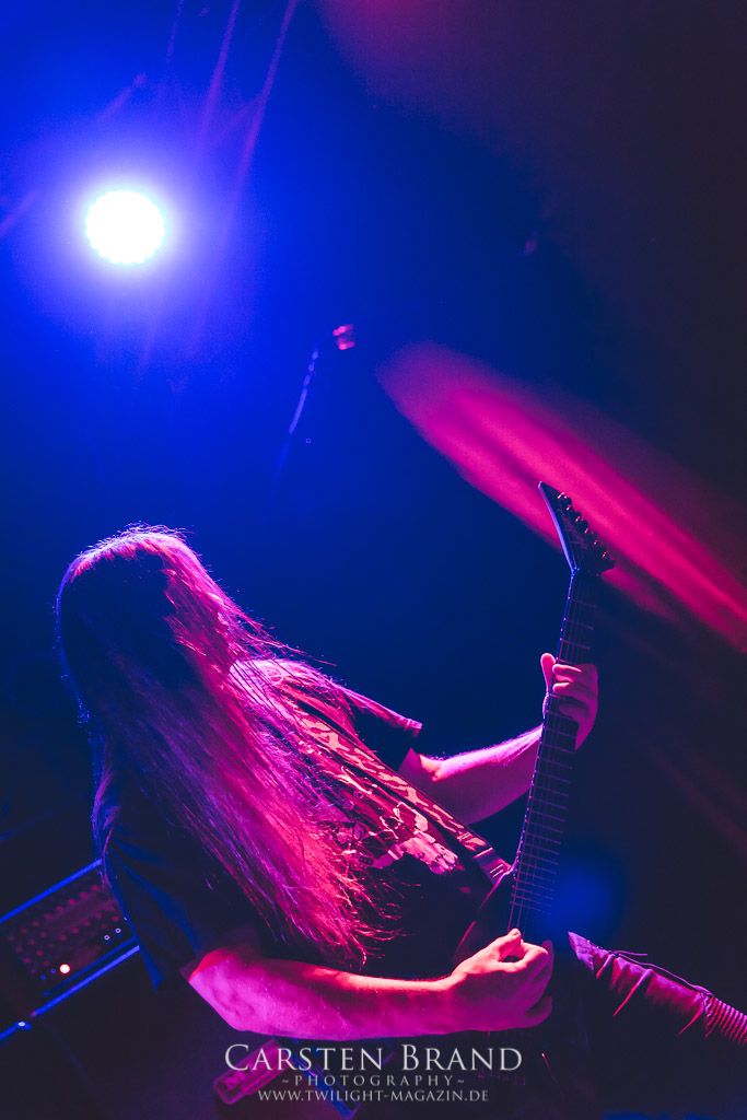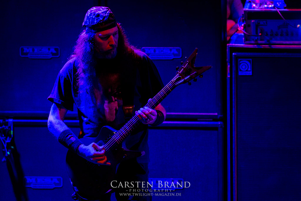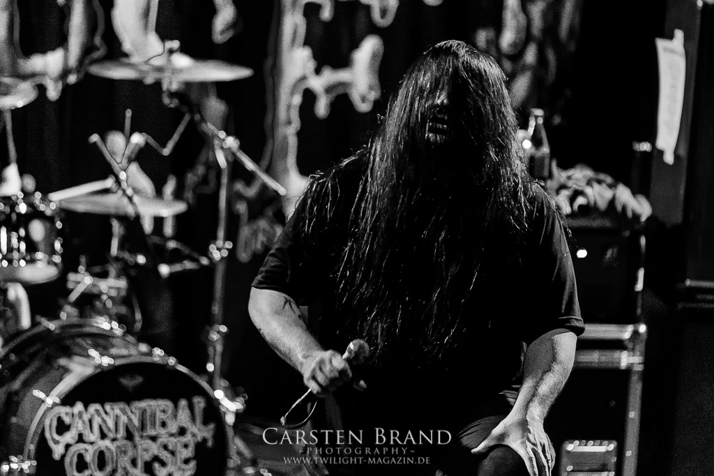 Dann wird es dunkel und Zeit für den Headlinerdes Abends. Spielten die Vorband unter sehr guten Lichtverhältnissen, bleibt die Bühne bei CANNIBAL CORPSE stilecht recht düster. Ein wenig rote Schummerbeleuchtung unterstützt von ein paar blauen Spitzlichtern müssen ausreichen. Die Herren um Mastermind Fisher knüppeln mit neuem Material nach vorne. "Code of the slashers" eröffnet den Corpse-Reigen an diesem Abend. Dieser, für Corpse´sche Verhätlnisse fast schon ruhige Track, bildet den idealen Einstieg. Das Publikum ist von Sekunde 1 an dabei und zelebriert den Auftritt. Die Todeswalze gewinnt an Fahrt und führt mit "Only one will die" die Neuvorstellung des aktuellen Silberlings "Red before Black" fort. Musikalisch braucht man hier auf wenig Neuland zu hoffen. Aber das tut auch keiner. CANNIBAL CORPSE liefern genau das ab, wofür sie seit Jahren stehen: kompromisslosen Death Metal auf den Punkt gebracht. Die neuen Stücke passen hervorragend ins Schema und zeigen die Vielfältigkeit der Band. Es wirkt zu keiner Zeit so, als hätte man sich irgendwie neu erfinden müssen. "Scourge of Iron" bildet die Brücke zu älterem material. Die Corpser kehren für kurze Zeit zum Midtempo zurück. Allerdings ist diese Verschnaufpause nur als Anlauf zu werten. Mit gewohnte Dampframmen Manier geht es in den zweiten Teil der Setlist, gespickt mit Highlights aus der Discografie. Von "Pounded into dust" über "Devoured by vermin" bis zu "Stripped, raped and strangled" fehlt keiner meiner persönlichen Highlight der Band. Die Todesmaschiene CANNIBAL CORPSE marschier tunaufhörlich durch das Musikzentrum. Klassischer Weise wird die Setlist vom allseits bekannten Hammer Smashed Face abgeschlossen und das Publikum in die Nacht entlassen. Zusammenfassend haben CANNIBAL CORPSE einmal mehr bewiesen, dass sie eine unheimliche Live Macht darstellen und zu Recht an der Spitze der Death Metal Szene stehen. Eine klare Empfehlung an alle, die noch ausstehenden Tourdaten wahrzunehmen!