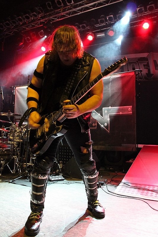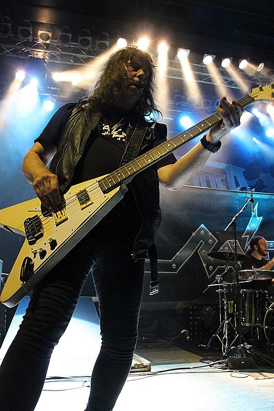 Trotz des verspäteten Einlasses begann die Show pünktlich um 20 Uhr mit der NWoBHM Legende RAVEN. Die Brüder Gallagher mussten auch am heutigen Abend ohne Drummer Joe Hasselvander auskommen, der bereits das ganze Jahr aus gesundheitlichen Gründen ausgefallen ist. Wer der junge Mann hinter den Kesseln war, weiß ich nicht – KILL RITUAL Trommler Dave Chedrick, der zuvor ausgeholfen hatte, war es jedenfalls nicht. Wie auch immer, optisch hätte vielleicht am besten der gute Gunter Gabriel in die Band gepasst, aber man sollte sich vom stolzen Alter der Herren nicht täuschen lassen, denn John (Bass, Gesang) und Mark (Gitarre) legten vom ersten Ton an richtig los. Vor allem Mark tobte über die Bühne wie ein Duracell-Hase an der Starkstromleitung. Und John war stimmlich erstaunlich gut erhalten und stieß während der Show den ein oder anderen spitzen Schrei aus, der einen Rob Halford in Verlegenheit gebracht hätte. Los ging es mit „Destroy all Monsters“ vom aktuellen „Extermination“ Album. Das 2015er Albumwurde zudem noch mit „Faster than the Speed of Light“, „Battle March Tank Treads“ und „Hard Ride“ gewürdigt. Ansonsten gab es einen wilden Ritt durch die Bandgeschichte und die anwesenden Fans bangten u.a. zu „All for One“, „Rock until you drop“ oder „Hung, Drawn & Quartered“, welches erstmals auf der Playlist stand. Neben dem obligatorischen Gitarrensolo gab es noch ein unfreiwilliges Basssolo, da Marks Gitarrentechnik nicht immer so wollte wie er. Gegen Ende der Show schob der Dreier noch eine Hommage an den jüngst verstorbenen Malcom Young (AC/DC) ein und zockte ein paar Takte von „It’s a long way to the top“. Dass der Song wahr ist, haben die Wahl-Amis von RAVEN am eigenen Leib erfahren. Vielen der Altrocker auf dem Balkon des Capitol schienen RAVEN überhaupt gar nicht bekannt zu sein, sie ließen sich aber dennoch zu wohlwollendem Kopfnicken hinreißen. Für mich zeigte sich live, was auch für die Alben der Band gilt: Neben einigen richtig guten Songs gibt es auch viel Füllmaterial. Trotzdem war ich positiv angetan vom Auftritt des Trios aus Newcastle.