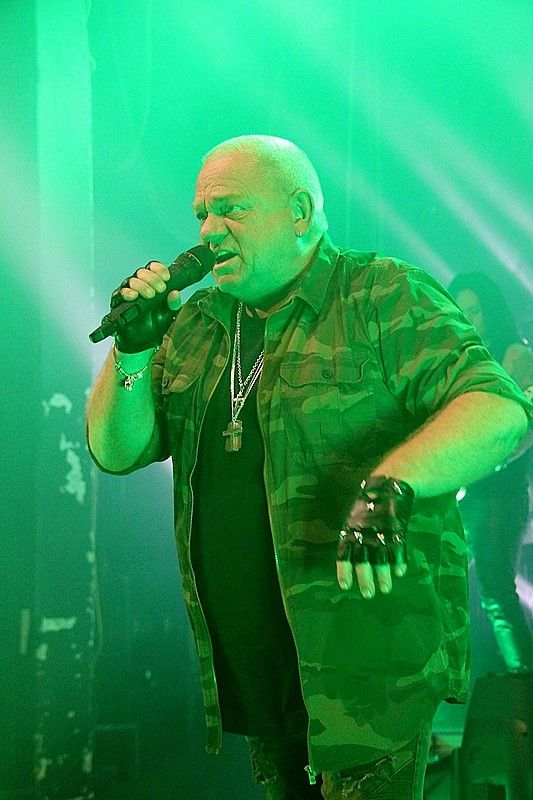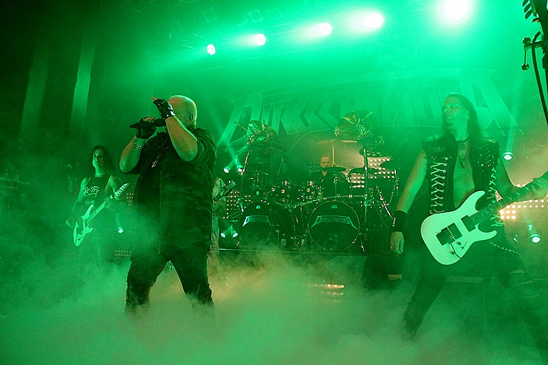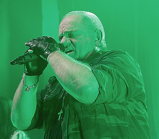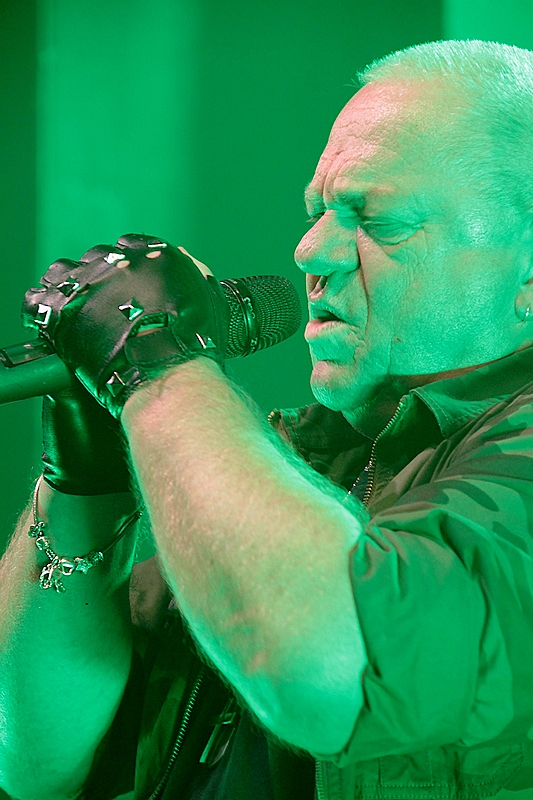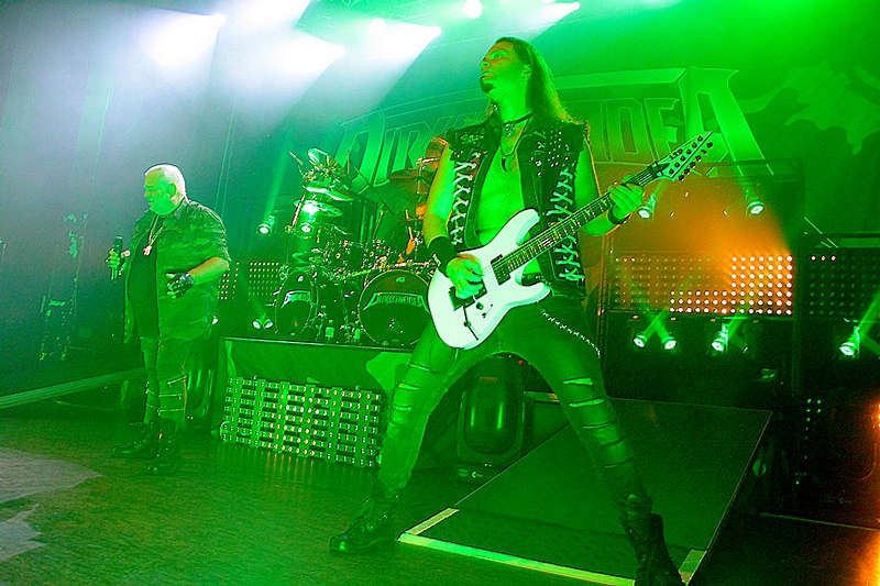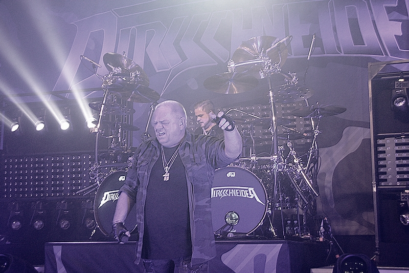 Nachdem die Bühne von der RAVEN Technik befreit worden war, hieß es zunächst einmal warten. Um 21.30 Uhr kündigte das Intro dann den bevorstehenden Auftritt von DIRKSCHNEIDER an. Warum man heutzutage immer komplette Songs über mehrere Minuten als Intro verwendet bleibt mir jedoch ein Rätsel. In grünes Licht gehüllt und mit mehr Nebeleinsatz als zu Beginn des Unternehmen Barbarossa enterten dann die Musiker die Bühne und eröffneten den ACCEPT-Gedächtnisabend mit „The Beast Inside“. Wie ein tropfender Wasserhahn animierte der stampfende Rhythmus des Songs zum mitschunkeln. Das Gitarrenduo Andrey Smirnov und Bill Hudson zeigte sich mal wieder perfekt aufeinander eingestimmt, während Basser Fitty zusammen mit Dirkschneider Sohn Sven für den richtigen Antrieb in der Rhythmus-Sektion sorgte. Altmeister UDO prustete und stampfte wie ein altes Dampfross auf dem Weg von Santa Clara nach Santa Fe auf der Bühne hin und her und quakte seine Lyrics in bekannter Manier in die Flüstertüte. Die ersten Highlights kamen für mich mit „Bullet Proof“ und „Midnight Mover“, welches es aus der alten Playlist ins neue Programm geschafft hatte. Wer entschieden hat, dass statt „I don’t wanna be like you“ lieber „Protectors of Terror“ ins Programm genommen werden sollte, weiß ich nicht, es war aber die falsche Entscheidung. Immerhin überzeugte die „Objection Overruled“ Ballade „Amamos La Vida“ deutlich mehr als ich anfangs befürchtet hatte. Immerhin, die ersten elf Songs schafften DIRKSCHNEIDER in guten 45 Minuten. Na ja, UDO war ja nie ein Fan der vielen Worte und so hielt er sich auch am heutigen Abend nicht mit großen Reden auf und beschränkte sich im Wesentlichen darauf zu sagen, dass er auch nicht wisse, was er sagen soll. Ja, dann sagt man eben am besten nichts und spielt lieber noch ein paar Songs. Mit „Stone Evil“ und „Breaker“ ging es in die zweite Runde des Abends, die durch ein wenig Solorei der Saitenhexer in die Länge gezogen wurde. Erstaunlich war dann, dass mit „Hard Attack“ ein Song des letzten ACCEPT Albums mit Dirkschneiderischer Beteiligung auf der Playlist stand. Ich hätte ja gern noch „Crossroads“ gehört, aber dass Peter Baltes für das Gesangsduett gewonnen werden könnte, wäre wohl doch etwas zu viel verlangt gewesen. Andererseits hat die Band mit „X-T-C“ ja auch einen Song vom „Eat The Heat“ Album gespielt, auf dem DIRKSCHNEIDER gar nicht mitgemacht hatte.