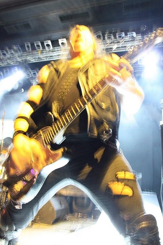 Den Fans um uns herum schien es trotzdem zu gefallen: Der eine schaute sich die Band zur Sicherheit lieber gleich durch eine Spacesonnenbrille an, die mir bisher nur von „Amboß“ aus „Otto – der neue Film“ bekannt war. Andere schüttelten und malträtierten den Nacken und Rücken ihres Begleiters dermaßen, dass ich vorsorglich schon mal die Halskrause rausholen wollte und mich sorgte, ob die Dame wohl versehentlich auf einer ungesicherten Stromleitung Platz genommen hatte. Zwischendurch wurde man um Leergut angeschnorrt, dessen Erlös dann in ein Tourshirt investiert werden sollte. Das ist mir, wenn ich mich nicht irre, zuletzt im Frühjahr 2000 im Göttinger JUZ beim LEATHERFACE Konzert passiert. Damals drängte sich ein ranziger Punk mit aufgeschnittener Cola-Dose durch die Reihen und versuchte, sich die Eintrittskarte zu refinanzieren. Eigentlich fehlte heute nur, dass der bekennende ACCEPT Jünger J.K. aus S. vom Balkon des Capitols in die Menge strullte. Aber wenigstens hatte es beim Kollegen neben uns mittags in der Kantine wohl Texanischen Bohneneintopf gegeben, so dass er jeden Song des Abends freudig auf der Analtrompete mitspielte. Genießen mit allen Sinnen eben.