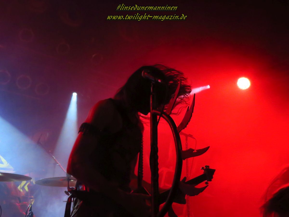 Als Brustlöser fungieren die Australier von ELM STREET, die - ohne dies abwertend zu meinen - wie eine räudige Sentenced-Version ohne Gothic, stattdessen mit klassischen Achtziger - Heavy und Thrash Metal - Einflüssen daher kommt. Das ist stilistisch nicht sonderlich spektakulär aber handwerklich mehr als solide. Trotz den klischeebeladenen Coverbildern auf den Bannern und Aufstellern ist es allerdings äußerst unterhaltsam und spaßig. Hannover taut im Laufe des Sets mehr und mehr auf und weiß die Jungs, die sich performancemäßig auf begrenzter Bühne und mit wenig Licht noch nicht ganz so souverän in Szene zu setzen wissen, nicht erst mit dem, Altmeister Dio gewidmeten, Rausschmeißer "Metal Is The Way" angemessen zu huldigen. EVIL INVADERS wissen den begrenzten Raum und das Licht da schon viel effektiver einzusetzen und legen gleich mal zwei Schippen drauf. Auch die Belgier sind bisher unter meinem Radar hindurch geflogen.