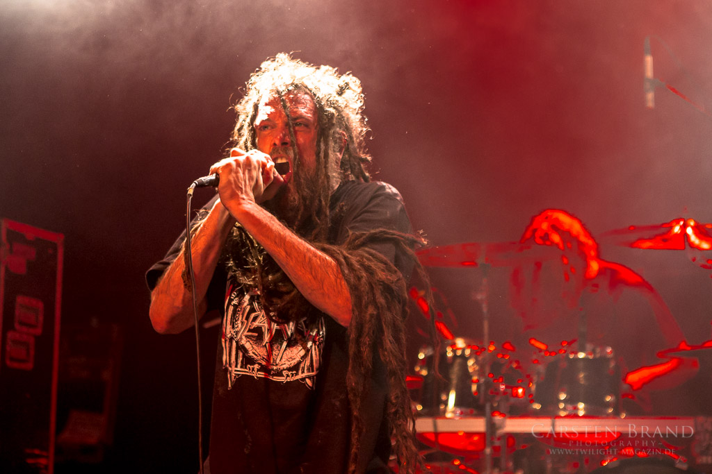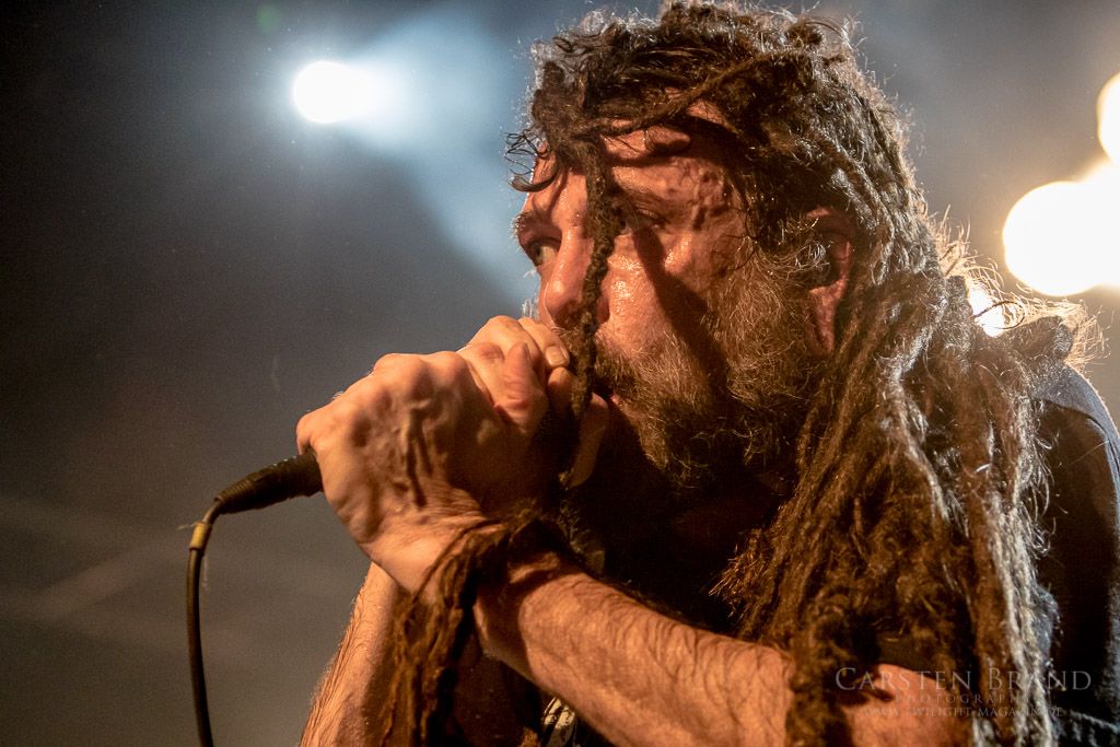 Was kann denn jetzt noch kommen, nachdem drei großartige Bands so hervorragend vorgelegt haben? Eine eigentlich schwere Aufgabe, gäbe es da nicht den werten Herren Barnes. Ohne viel Schnörkel, ohne Nebel und große Lichtshow steht der Frontmann samt seiner Band auf der Bühne und eröffnet mit "Silent Violence" gar nicht mal so leise. Die Markthalle scheint nochmal einen Besucherschub erhalten zu haben, und in den ersten Reihen ist nurn der pure Krieg ausgebrochen. "Revenge of the Zombies" folgt erbarmungslos und lässt keinen Freiraum zum atmen. Der Abend hat hier definitiv seinen Höhepunkt erreicht und SIX FEET UNDER bieten einen mehr als würdigen Headliner. Auch wenn auf Corpse Paint a la HATE und Nebel a la MARDUK verzichtet wird, bietet die Show der Amerikaner durch ihre Reduktion auf die Musik feinste Unterhaltung. Ein neuen Silberling haben SIX FEET UNDER nicht zu bieten, und die Setlist besthet auch eher aus älteren Werken, was der Stimmung aber zu keinen Zeitpunkt einen Abbruch tut. Chris Barnes ist in Höchstform und man sieht der gesamten Band die Spielfreude an. Ein würdiger Abschluss des Hatefest Packages.