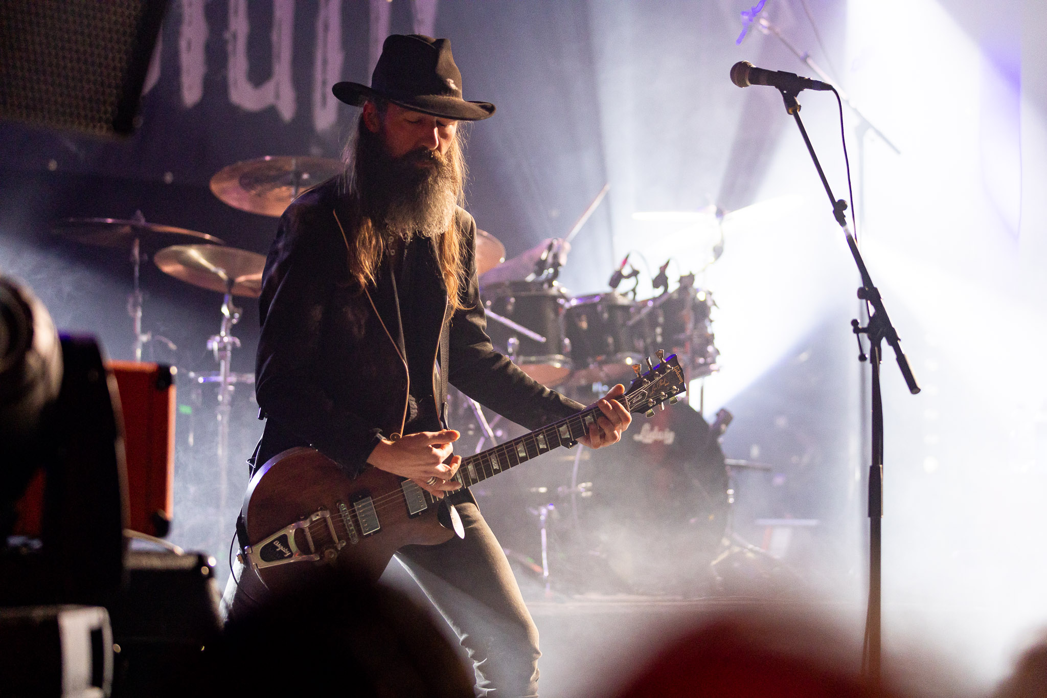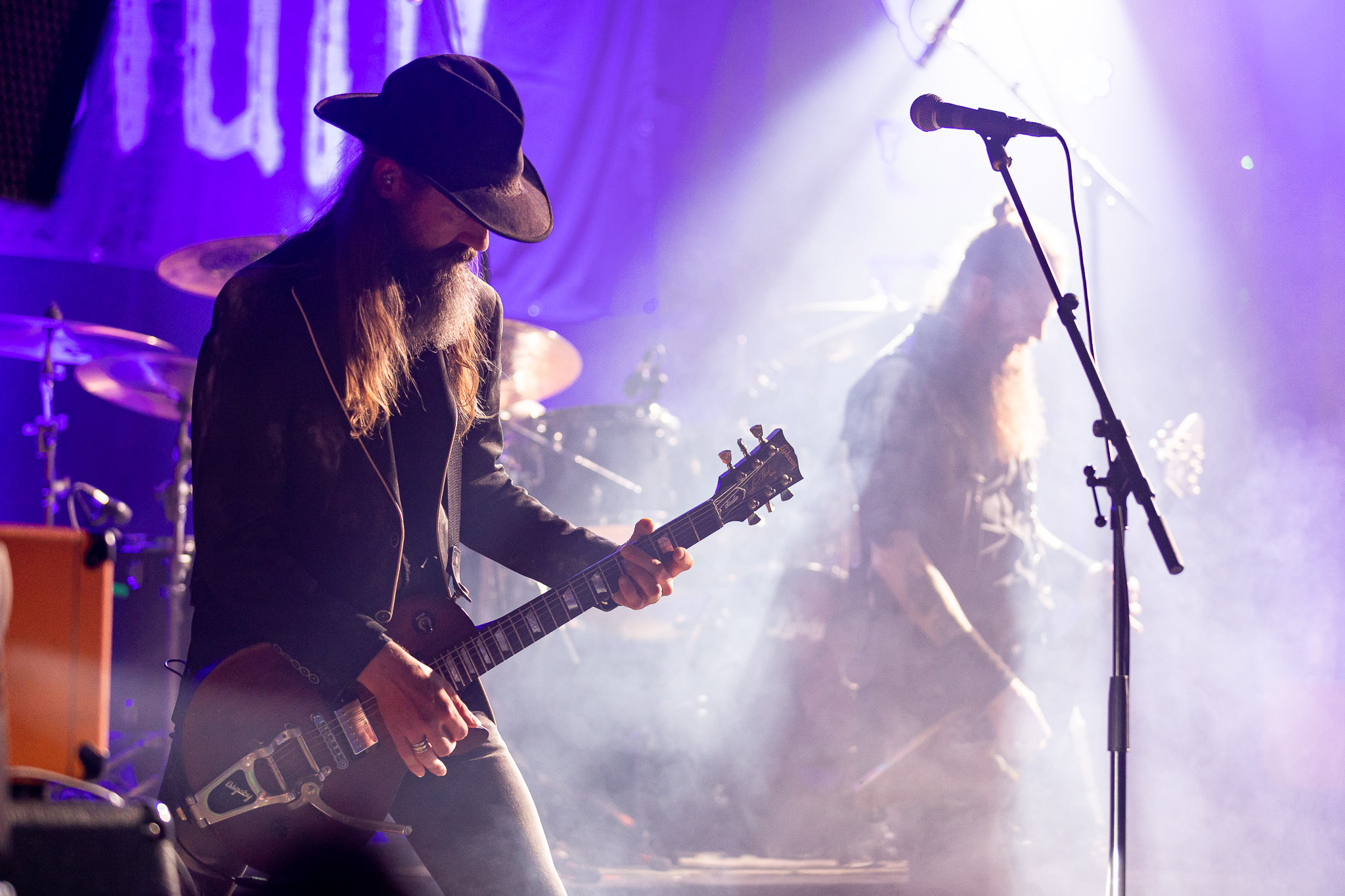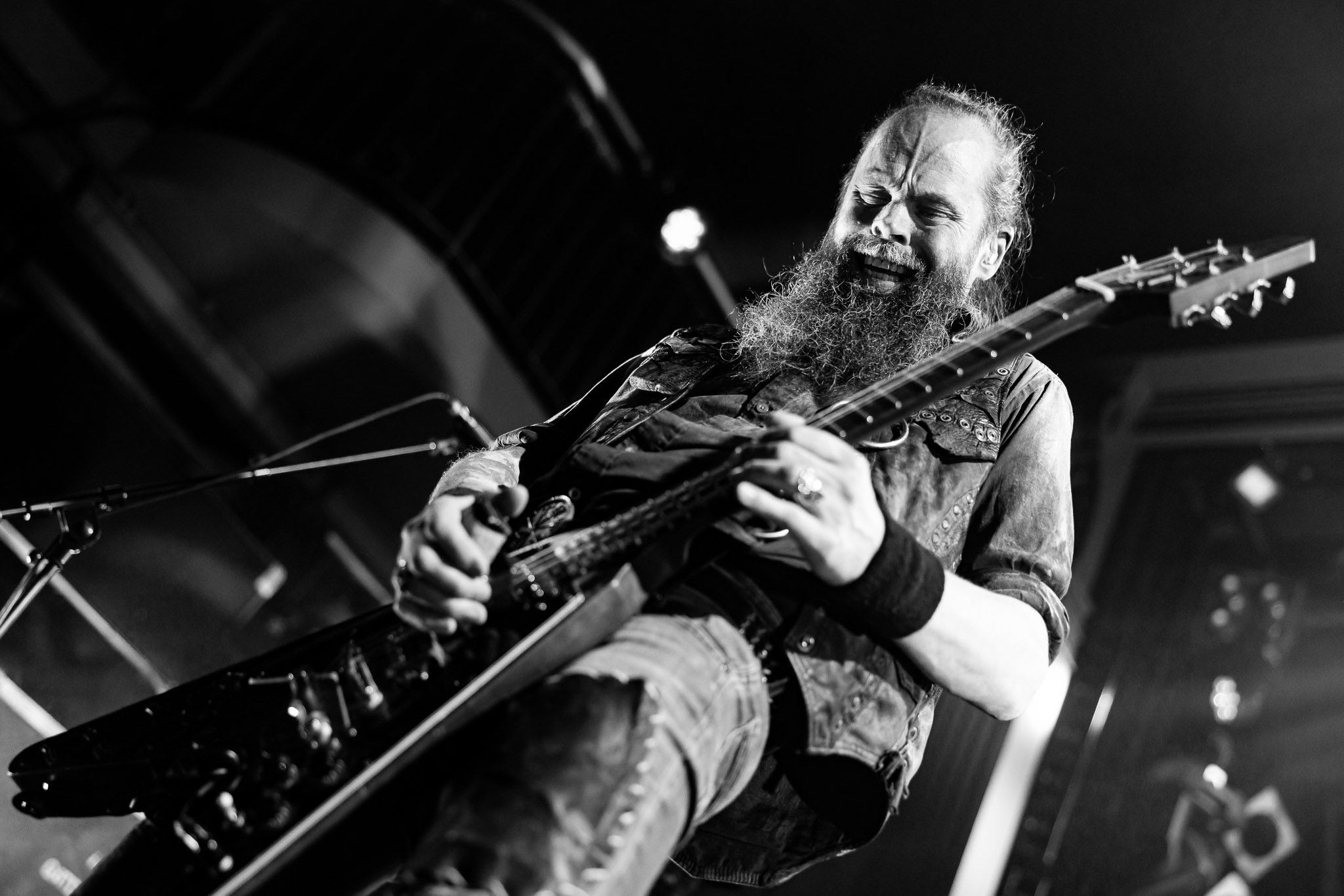 Nach kurzer Umbaupause kündigt das Backtrog die mächtigen Solstafir an. Zudem steht bereits Aðalbjörns Gitarre rechts an der Bühne, „Náttfari wird als Intro gespielt. Die Band braucht keine weitere große Einführung oder Vorstellung. Mit deren Betreten der Bühne beginnt das Publikum mit voller Begeisterung mitzugehen. Charisma und absolute Bühnenpräsenz werden hier lehrfilmmäßig dargeboten. Ich habe die Isländer schon ein paar Mal live erleben dürfen, doch dieser Auftritt sollte die bisherigen Live Darbietungen in den Schatten stellen. Mit „Nattmal“ und „Köld“ geht es hinein in den isländischen Abend. SOLSTAFIR zeigen eindrucksvoll, dass es keiner vieler Worte braucht, um das Publikum zu lenken. Sänger Aðalbjörn schafft es mit einfachen Gesten, das Publikum zur völligen Ruhe zu bringen, als einige Zuschauer in den ruhigen Parts das Schreien anfingen. Ein weiteres Highlight des Abends ist wohl der Geburtstag von Sæþór Maríus Sæþórsson. Mit gewohnt minimalistischer Gestik nimmt er die Glückwünsche des Publikums an.