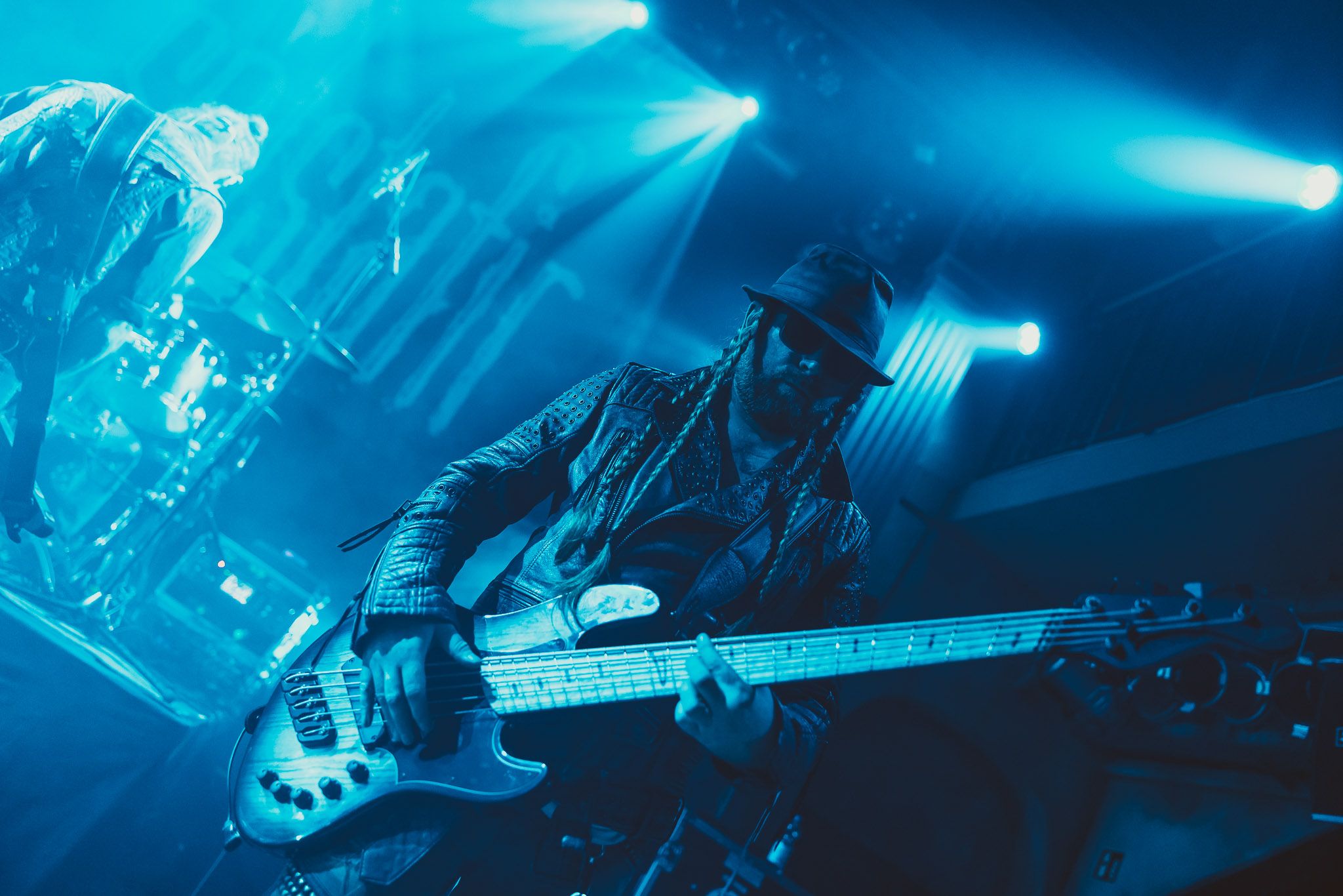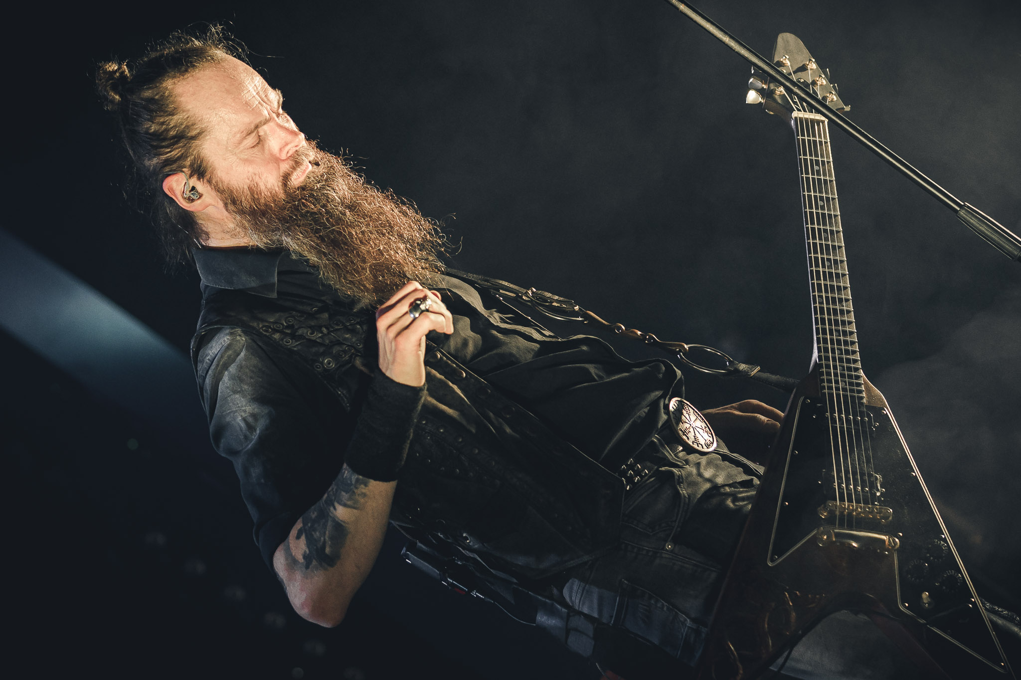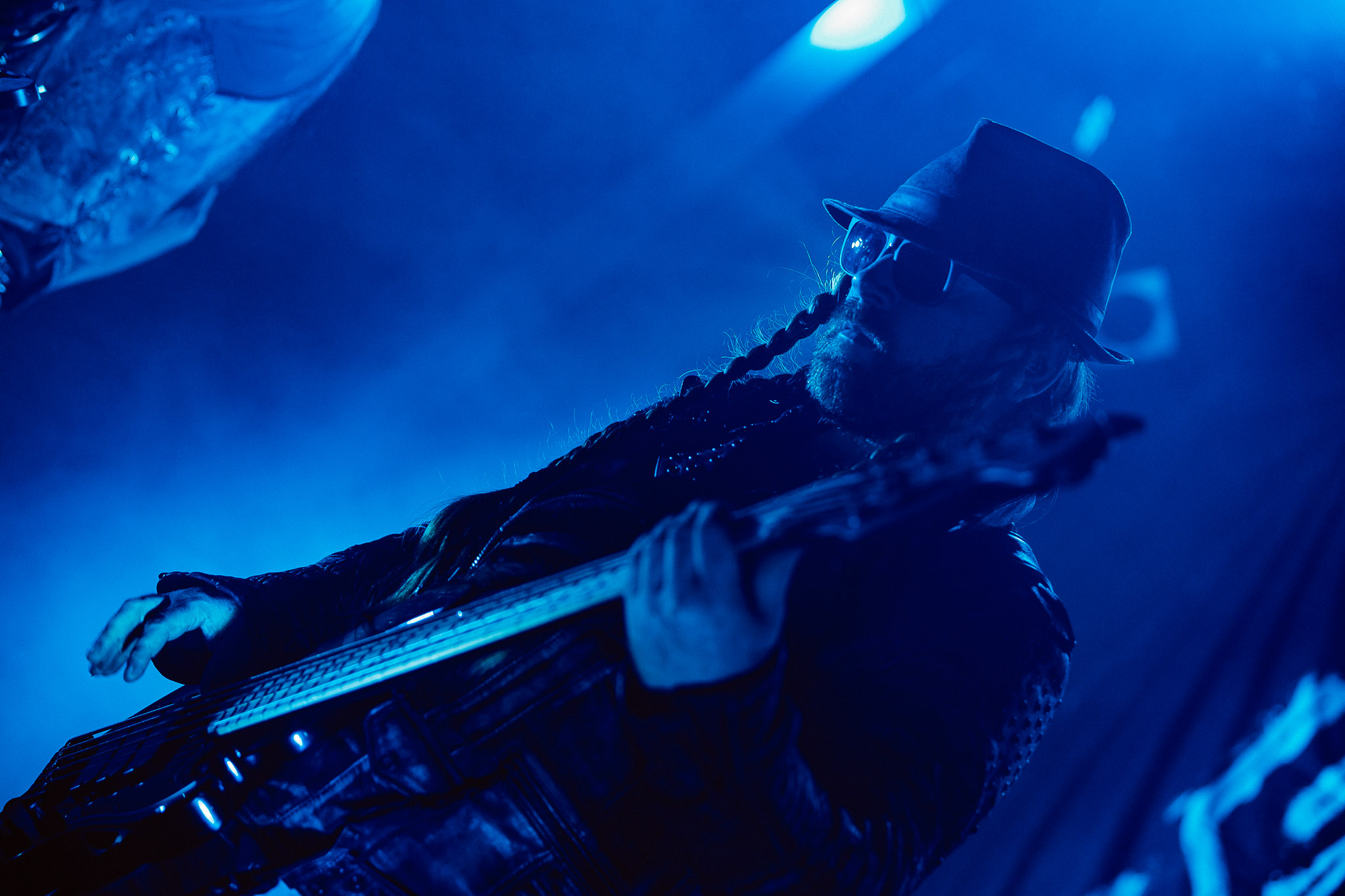 Nach kurzer Umbaupause kündigt das Backtrog die mächtigen Solstafir an. Zudem steht bereits Aðalbjörns Gitarre rechts an der Bühne, „Náttfari wird als Intro gespielt. Die Band braucht keine weitere große Einführung oder Vorstellung. Mit deren Betreten der Bühne beginnt das Publikum mit voller Begeisterung mitzugehen. Charisma und absolute Bühnenpräsenz werden hier lehrfilmmäßig dargeboten. Ich habe die Isländer schon ein paar Mal live erleben dürfen, doch dieser Auftritt sollte die bisherigen Live Darbietungen in den Schatten stellen. Mit „Nattmal“ und „Köld“ geht es hinein in den isländischen Abend. SOLSTAFIR zeigen eindrucksvoll, dass es keiner vieler Worte braucht, um das Publikum zu lenken. Sänger Aðalbjörn schafft es mit einfachen Gesten, das Publikum zur völligen Ruhe zu bringen, als einige Zuschauer in den ruhigen Parts das Schreien anfingen. Ein weiteres Highlight des Abends ist wohl der Geburtstag von Sæþór Maríus Sæþórsson. Mit gewohnt minimalistischer Gestik nimmt er die Glückwünsche des Publikums an.