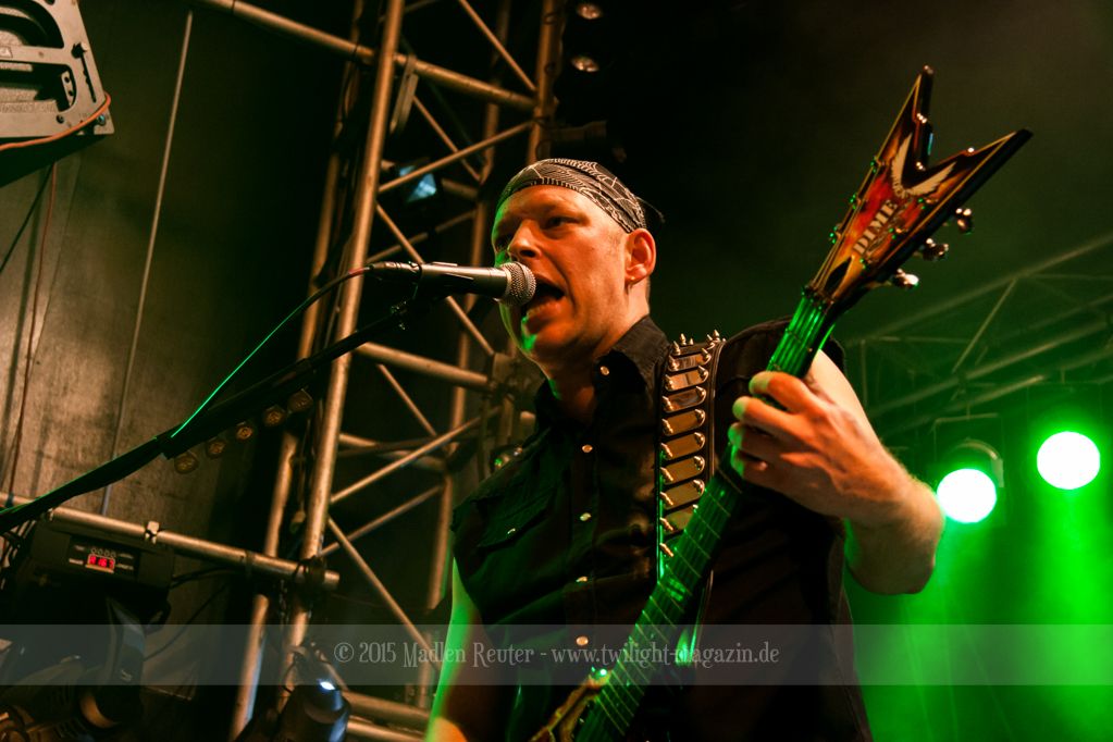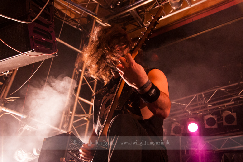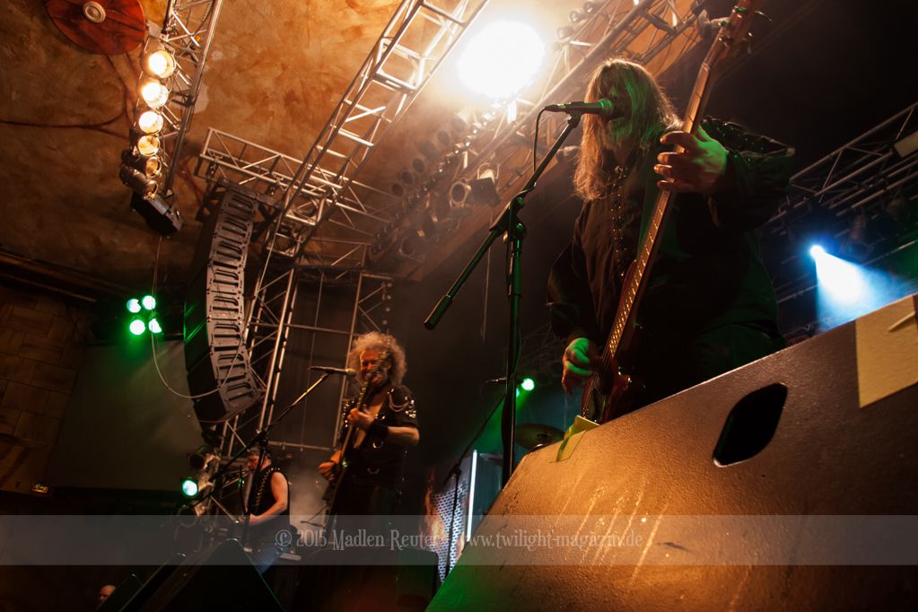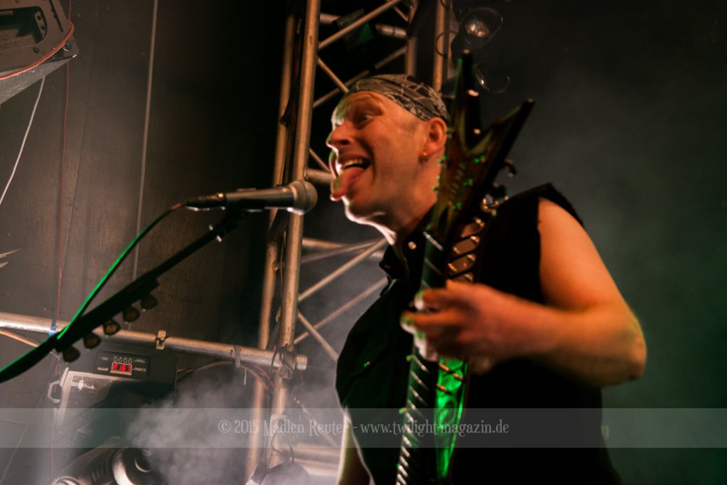 Zum Aufwärmen brauchte es da nur den richtigen Supportact. Zum Glück hatten die Finnen hierfür die Rheinländer von PALACE mit dabei. ACCEPT küsst RUNNING WILD, so würde ich die Band kurz beschreiben. Schon seit über 30 Jahren im Geschäft, wissen die Herren wo der Frosch die Locken hat und gingen dementsprechend in die Vollen. Bei diesem Hard Rock blieb kaum noch jemand unberührt und mehr Leute begaben sich vor die Bühne. Spitzenmäßiger Sound, geile Songs und sehr solide Performance – rundum ein sehr gelungener Auftritt. Und auch ein würdiges Abschlusskonzert (für sie war es die letze Show auf dieser Tour) für die Vier. Auch um Interaktion mit den Leuten waren die Urgesteine sehr bemüht und auf diese wurde auch dankend eingegangen. Ein einziges Problem bestand darin, dass der übereifrige Gitarrist ein Drum-Mikro umgehauen hatte und dadurch kurzzeitig Soundprobleme auftraten. Die wurden allerdings flott behoben und schon konnte ordentlich weitergerockt werden. PALACE haben fleißig bei dem Publikum gepunktet und haben die Meute für die Monster auch dementsprechend aufgewärmt.
