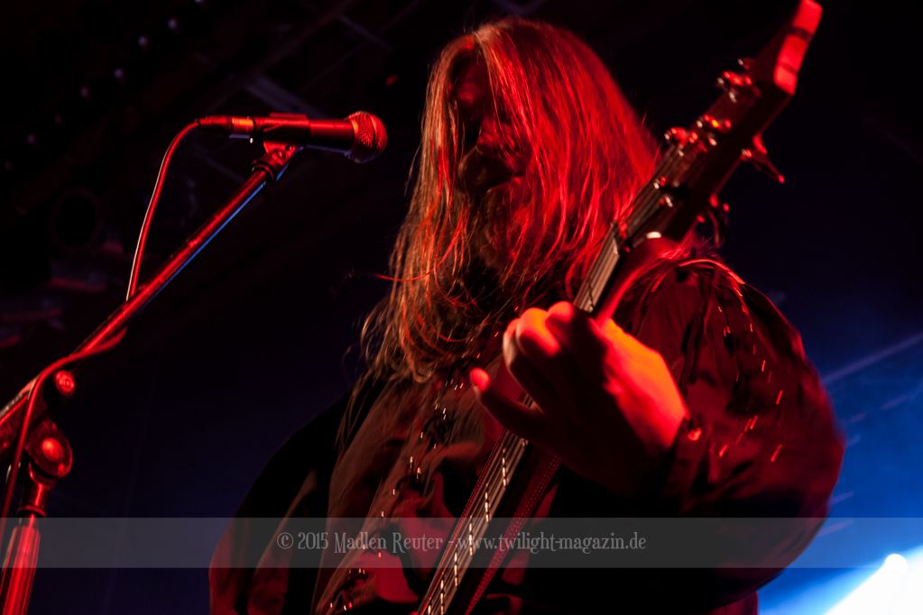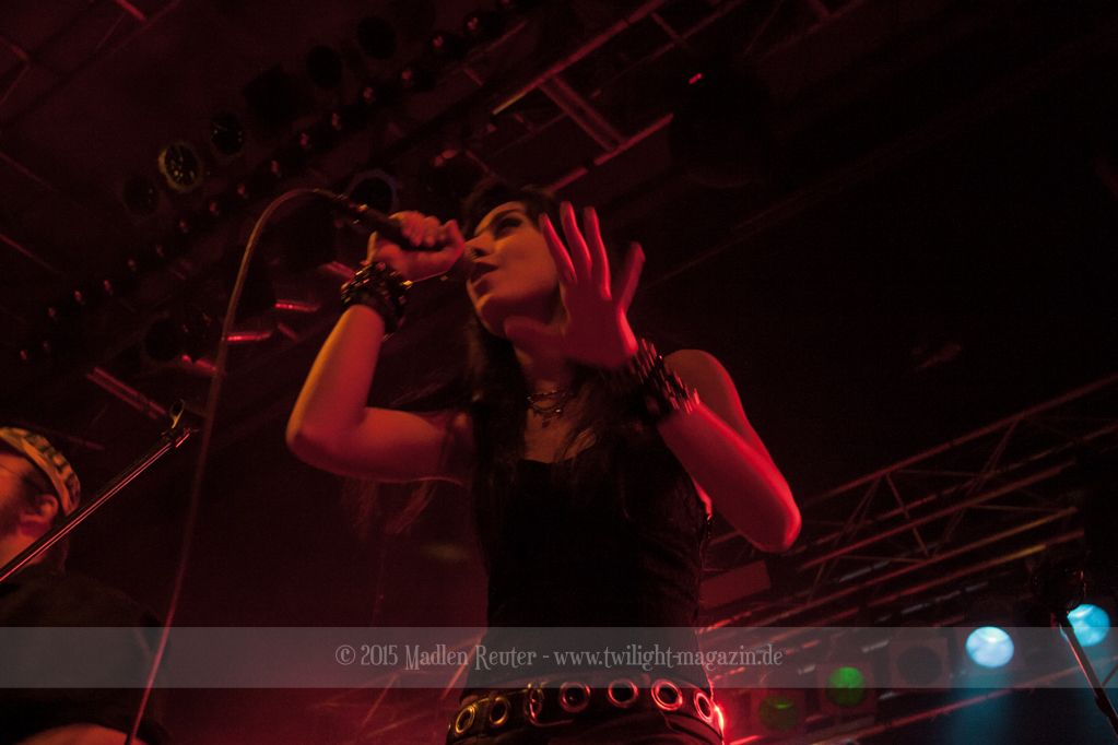 Den Anfang machten die Italiener von SINHERESY. Leider konnten sie mit keinem guten Sound aufwarten. Die Drums waren viel zu übersteuert und darunter hatte der Gesang gelitten. Hier war dies besonders fatal, da die Sängerin auch so schon eine relativ gebrechliche Stimme zu haben scheint. Und wären da nicht diese vielen, seltsamen Tempowechsel innerhalb der Songs, könnte die Band eigentlich ganz nett sein. Aber in jedem Fall schien die Band Spaß gehabt zu haben und sie bemühten sich sehr um Interaktion mit dem Publikum. Aber irgendwie wollte der Funke nicht so recht überspringen. Auch das Licht während ihrem Auftritt war nicht wirklich berauschend – alles ziemlich dunkel und nicht gerade fotografenfreundlich. Insgesamt machte die Band einen noch recht unerfahrenen Eindruck, was die, eher mittelmäßige, Performance erklären würde. Ganz warm wurde ich mit dieser Truppe einfach nicht, auch dem Rest des Publikums schien es ähnlich zu gehen.