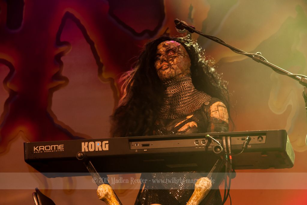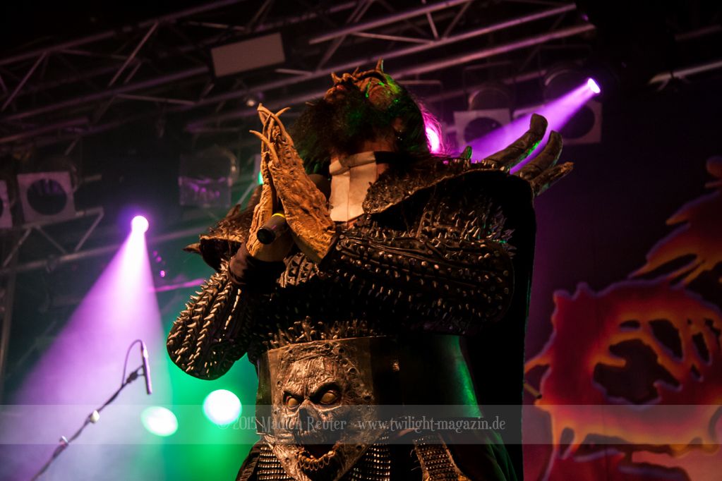 Dann wurde es auch schon Zeit für LORDI. Das Licht ging aus und „God Of Thunder“ hallte aus den Boxen. Kurz darauf betrat das freundliche Kabinenpersonal die Bühne, angeführt von einer Stewardess, die auf der Bühne eine kurze Sicherheitseinweisung gab. Mit „Nailed By The Hammer Of Frankenstein“ legte die Monstertruppe dann direkt mit einem genialen Stimmungsmacher los. Nicht nur die Band nutzte die Power dieses Songs aus, sondern auch das Publikum lässt sich in dessen Bann ziehen. Den Eurovision-Hit „Hard Rock Hallelujah“ brachten sie bereits als Drittes. Aber bei einer derart starken Setlist sei ihnen das erlaubt. Über den gesamten Abend war der Sound absolut spitzenmäßig, lediglich das Keyboard war etwas zu leise. Nebst wuchtigem Sound durften sich die Besucher auch über eine geniale Lichtshow freuen, die eine bombastische Stimmung erzeugte. Allerdings wurde die Setlist ein wenig gekürzt, und so flogen „Man Skin Boots“ und „Sir, Mr. Presideath, Sir!“ aus dem Programm. Schade um Letzteren, da dieser einfach auf die Bühne gehört hätte. Während „It Snows In Hell“ hat es dann kurzzeitig wirklich geschneit und bei „Hell Sent In The Clowns“ wurden die ersten Reihen von monströsen Clowns mit Kunstblut übergossen.