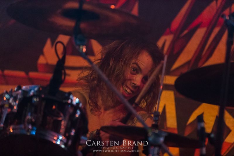 Zumal Sänger Adam nicht nur optisch einem gewissen Tompa ähnelt, auch wenn er stimmlich nicht so variabel und extrem agiert. Hier und da sind noch ein paar Schwarzmetall-Einflüsse heraushörbar. Aber obwohl die Jungs in der Co-Headliner-Position vom Publikum ordentlich abgefeiert werden ist sind mir viele der Songs zu gleichförmig, so dass in der guten Stunde des Gigs deutliche Längen aufkommen. Da mag sich Adam noch so gut ins Zeug legen, beeindruckender ist da doch die lässige wie knochentrockene Drum-Performance von Wandertrommler James Stewart, der u. a. bei Vader aber auch bei den Niedersachsen von Deny The Urge die Stöcke schwingt. Ich möchte die Leistung von Skeletonwitch hier keineswegs schmälern aber in Sachen Eigenständigkeit (Deathrite, Evil Invaders, Mantar) und Intensität (Evil Invaders) ziehen sie in diesem musikalisch großartigen Billing aus meiner Perspektive eindeutig den Kürzeren.