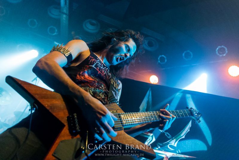 Der Konzertabend beginnt verkehrsbedingt mit einer Punktlandung zum Intro von DEATHRITE. Die Sachsen, die ich auf keinen Fall verpassen wollte, empfehlen sich auf dieser Tour nach der kürzlichen Veröffentlichung ihres jüngsten Werkes "Nightmares Reign" für höhere Weihen und verlassen sich dabei vollständig auf das Material von eben jenem Geniestreich. Eine durchaus risikofreudige Entscheidung, erschließt sich doch der ranzige, faulige Rock ´N´Roll-beeinflusste Death Metal nicht unbedingt beim ersten Hören. Mit dem einen oder anderen gradlinigem Song aus der Death-/Crust-Grind-Ära der eigenen Historie hätte man es sich sicher deutlich einfacher machen können, das Publikum der sich langsam füllenden Location auf die Seite zu ziehen. Aber Deathrite erfinden sich halt immer wieder neu und haben folglich auch kaum Probleme, mit dem neuen Material zu früher Stunde in Hannover zu bestehen. Mit neuem Bassmann, der sein Instrument ordentlich und schön knarzig pumpen lässt und einem zweiten Gitarristen führt die Band den Death `N´Roll auf den "Left Hand Path" zurück und kreiert eine abgrundtief-morbide Todesmetall-Atmosphäre, wobei die Musik selbst mittlerweile wesentlich vielschichtiger und facettenreicher ist als es die Wurzeln des Quintetts sind. Die zweite Gitarre ist zweifelsohne eine Bereicherung. Insbesondere bei den schrägen Leads und Soli harmonieren und ergänzen sich Andy und Tom sehr gut, auch wenn die Klampfen gemeinsam deutlich mehr hätten sägen müssen. Tony ist zwar keine klassische Rampensau aber trotzdem ein unheimlich charismatischer Frontmann, der von seinem kräftigen Organ und seinen dezenten Gesten lebt, während Beff an den Trommeln das Fundament für den halsbrecherischen Deathrite-Groove legt. Auch wenn mir die Jungs auf dem Underground Remains Open Air im Sommer konstellationsbedingt wesentlich besser gefallen haben, so zieht man sich in der Opener-Position beachtlich bis amtlich aus der Affäre und provoziert sogar einige Zugabenforderungen. Und neues Album hin oder her: "Where Evil Arises" wäre zum Schluss Pflicht gewesen.