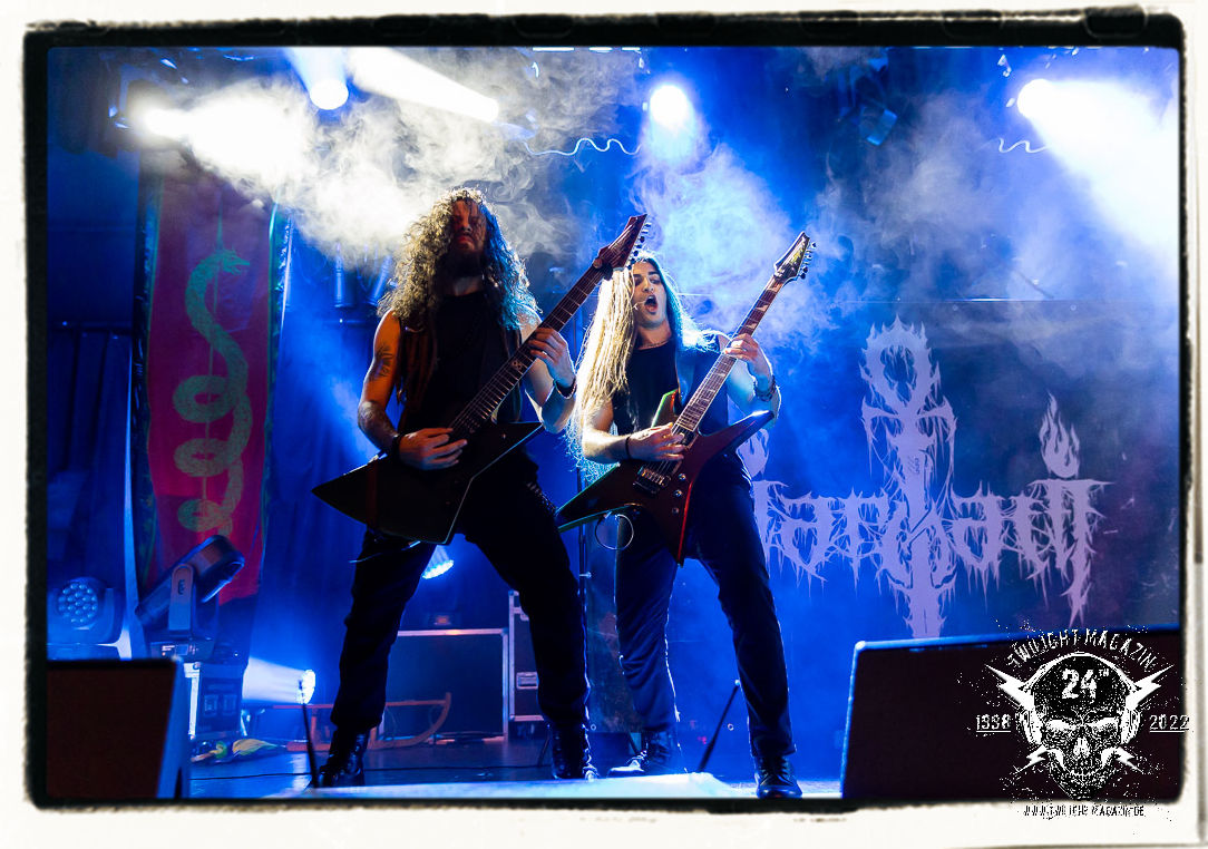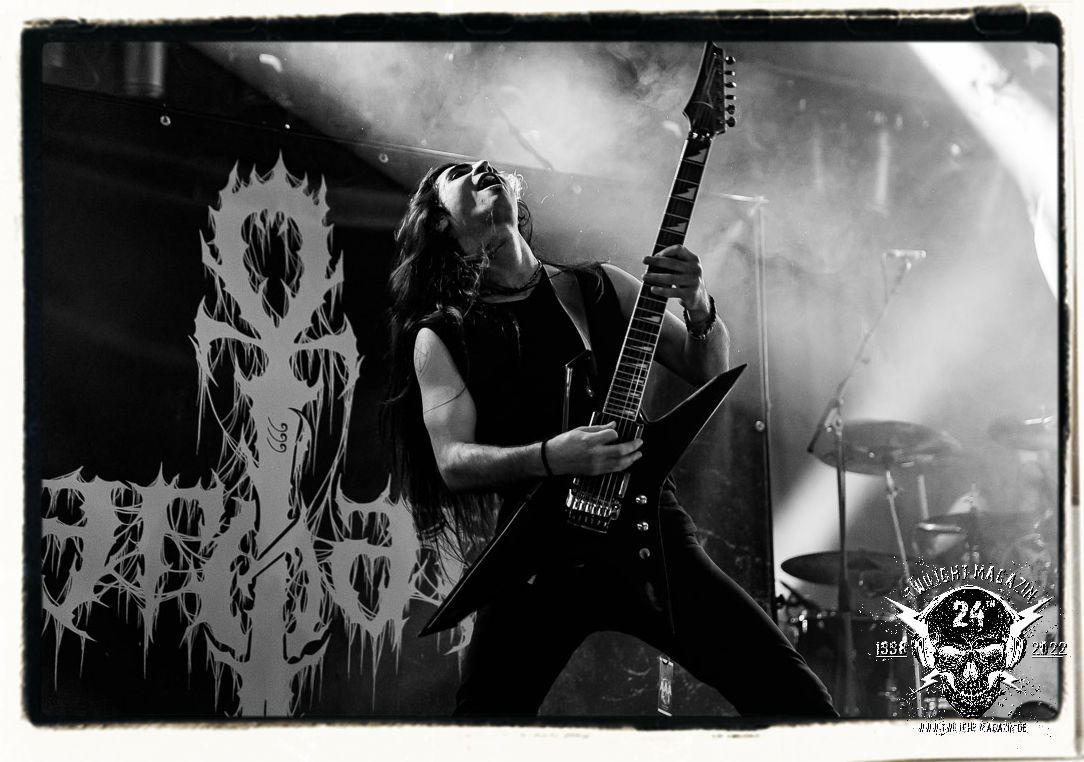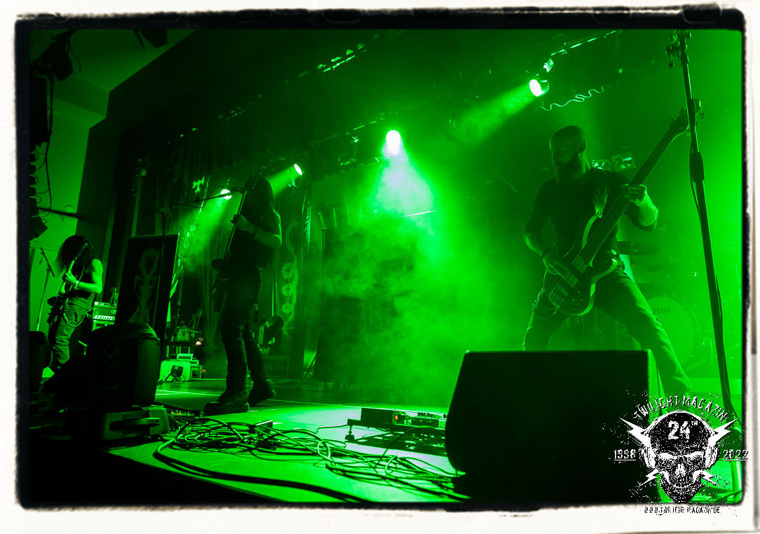 Abo kündigt seine Freunde von NARGATE an, die einst in Syrien gegründet wurden und die es mittlerweile nach Leipzig verschlagen hat. Die Band nimmt das Geschenk und die Herausforderung dankbar an, sich in diesem Rahmen präsentieren zu dürfen. Die Mischung aus Black Metal und Death Metal – Riffing, die mal melodiös, mal disharmonisch daher kommt und vom massiven, abwechslungsreichen Riffing lebt, mal groovend, mal treibend und mal rasend, wobei auch progressive Ansätze und orientalische Einflüsse herauszuhören sind. Noch ist das zwar alles nicht ausgereift, die Spielfreude und der Enthusiasmus des Quartetts werden mit zunehmender Spieldauer allerdings trotzdem vom Publikum honoriert. Für alle Beteiligten ein Einstieg nach Maß.