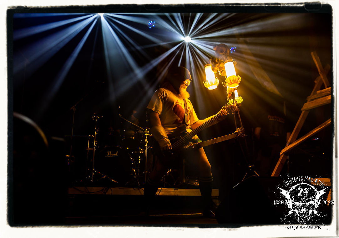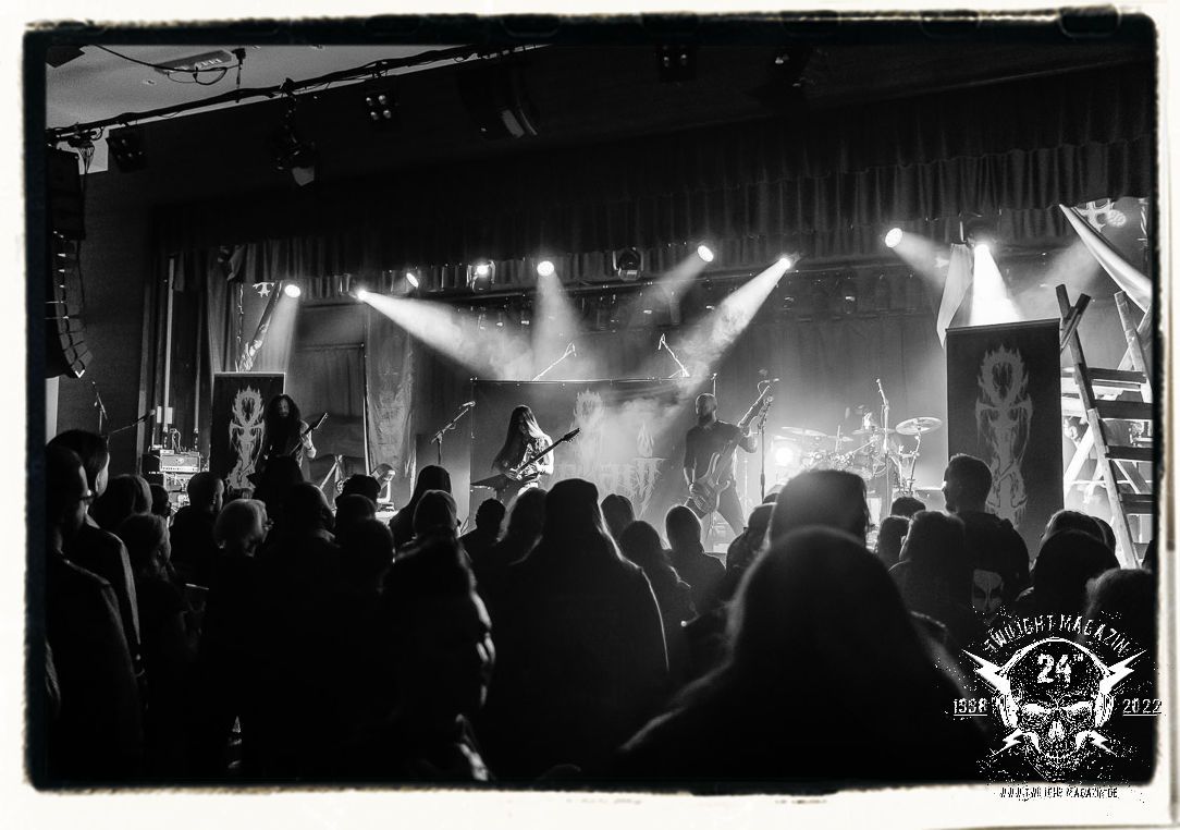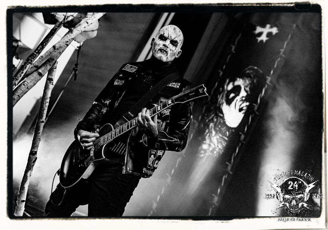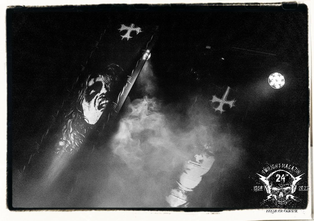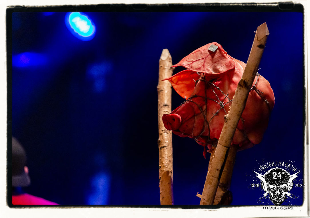 Danach ist Schluss mut lustig und es wird dunkel. Umbau und auch Soundcheck verlaufen zügiger als erwartet. Doch anschließend heißt es für alle in der mittlerweile gut gefüllten Location warten. Die Spannung steigt bei fahlem, düsteren Licht, das die Konterfeis der Protagonisten von 1990 - Dead, Hellhammer, Necrobutcher und Euronymus - in Szene setzt. Die vier übergroßen Banner hängen mit eben jenen schemenhaften Portraits, die einst das Originalplakat zierten, von der Decke und flankieren die Bühne auf beiden Seiten. Eine ganz eigene Geschichte könnte man über den Schweinekopf erzählen, der 1990 als Bühnendeko und Requisit zum Einsatz kam und sozusagen mit einem zweiten Leben beschenkt wurde. 2022 sind es vier Köpfe, aufgespießt auf Birkenholzpfähle, die am Bühnenrand präsentiert werden und das Schlagzeugpodest einrahmen.