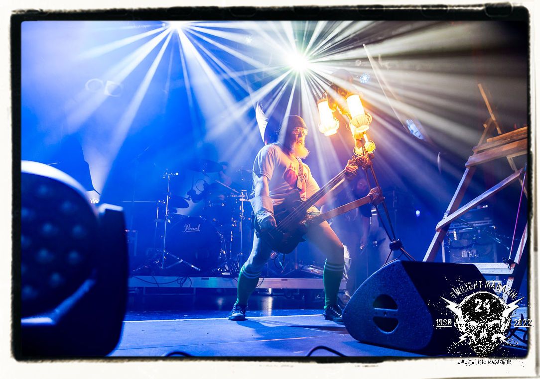 Die Urgesteine von MANOS waren schon am 26.11.1990 Vorband im Eiskeller. Damals normal, würde heute wohl kaum ein Veranstalter auf die Idee kommen, MAYHEM mit MANOS auf einen Einzelgig zu buchen. Allerdings verbindet MANOS mit den Schwarzmetallern MAYHEM ungeachtet vom kommerziellen Erfolg heute nach wie vor Die Anti-Haltung. Während sich diese bei MAYHEM in Form einer musikalischen Breitwand-Inszenierung zeigt, stehen MANOS für eine metallische Grind- und Hardcore-Persiflage, die Klischees einer testosterondominierten Szene ad absurdum führt. Das Ritual von Basser Eule, Gitarrist/Sänger Andrew und Drummer Ratze ist bunt, farbenfroh und lebensbejahend. Konzerte von MANOS dürfen und sollen Freude machen. Das Trio aus Querfurt in Sachsen-Anhalt ist nicht nur, vor allem aber im Osten Deutschlands absoluter Kult, weil sie es schaffen, brutalen Death Metal mit Hardcore, Punk und Grindcore über ihren ureigenen Humor zu verbinden, der trotz des subtilen Slapstiks authentisch, weder gekünstelt, noch albern wirkt. Und MANOS haben es bei ihrem Heimspiel daher auch nicht nötig, sich im historischen Schatten der Norweger zu verbiegen, sondern ziehen ihren Stiefel einfach durch. Einzig auf einen weihnachtlichen Tannenbaum am Bass verzichtet Eule am heutigen Abend. Ansonsten gibt´s das volle Programm inkl. "Ulehule", der Querfurter Bockwurst, "Komm in den Garten", "Biene Maja" oder "Teacher´s Pants" etc. pp. Gerutscht werden darf natürlich auch, denn das Publikum ist ein integraler Bestandteil einer jeden MANOS-Show. Nach rund einer Stunde ist der seriöse Teil des Abends dann auch vorbei. "Wer hat an der Uhr gedreht?", die Querfurter müssen sogar nachsitzen, da sie noch für eine Spontanzugabe auf die Bühne zurückgebrüllt werden.