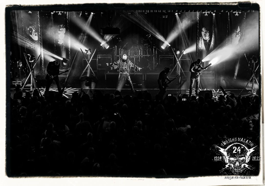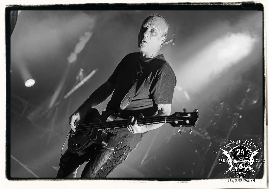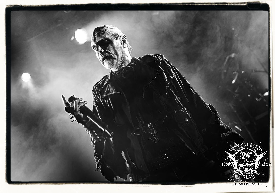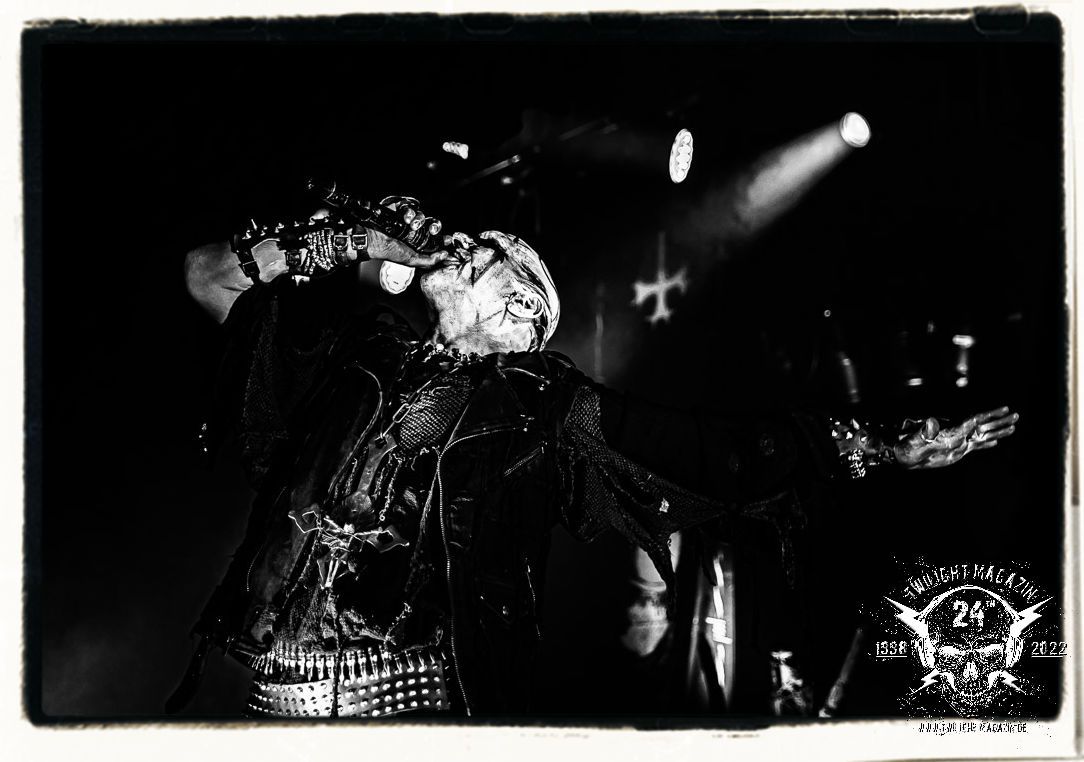 Die einstimmenden Klangkollagen gipfeln schließlich im Percussion-Intro "Silvester Anfang", welches nicht nur die "Deathcrush"-EP von 1987, sondern auch den Beginn des Konzertes einleitet. Endlich betreten Hellhammer, Necrobutcher, die beiden Gitarristen Teloch und Ghul sowie schließlich Sänger Attila Csihar die Bühne. Die Frage nach der Setlist stellt sich zunächst nicht. "Deathcrush", "Necrolust", "Funeral Fog", "Freezing Moon", bei dem die ursprüngliche "When it´s cold, when it´s dark..."-Ansage von Dead eingespielt wird, "Carnage", "Buried By Time And Dust", "Pagan Fears", "Chainsaw Gutsfuck" und schließlich das finale "Pure Fucking Armageddon" entsprechen den Songs, die MAYHEM im November 1990 mit Øystein Aarseth und Per Yngwe Ohlin alias Euronymous und Dead im Eiskeller zu Leipzig spielten. Bassist Necrobutcher lässt es sich nicht nehmen, seine ebenfalls auf dem Live-Album konservierte und seinerzeit der Irritation über die verhaltenen Publikums-Reaktionen geschuldete "Are you dead?"-Ansage noch einmal zu zelebrieren, um danach "Carnage" anzukündigen. Darüber hinaus verzichten MAYHEM glücklicherweise auf überflüssigen Firlefanz, sondern lassen die Musik sprechen. Und so zeichnen sie ein historisches Konzert und den Weg einer Band nach, die in den späten Achtzigern aus dem Death Metal - Underground kam und in der Entwicklung der Protagonisten und Musik schließlich im Black Metal Maßstäbe setzte. "Live in Leipzig" ist aus meiner Sicht auch gerade deshalb so bedeutend, weil es MAYHEM ungefiltert an der Schwelle zwischen den noch deutlich vom extremen Metal der Achtziger geprägten Frühphase in der Entwicklung zu dem Ausdruck zeigt, der schließlich mit dem 1994 veröffentlichten Meilenstein "De Mysteriis Dom Sathanas" nach dem Tod von Euronymous 1993 gipfelte und eine Ära der Band beendete. Natürlich ist das Format 2022 ein anderes und die Band um die verbliebene Rythmus-Sektion Hellhammber/Necrobutcher gewisserweise eine andere. Doch MAYHEM zelebrieren ihr Erbe tatsächlich würdevoll. Die Show ist nicht so chaotisch und abgefuckt, wie auf dem Party.San, was jedoch einer Doku zum Gig geschuldet sein könnte, die zum Revival parallel gedreht wird, und ich würde auch nicht ausschließen wollen dass auch dieser Abend in Leipzig seinen Weg auf einen Tonträger finden wird. Hellhammer ist wie meistens in der Dunkelheit bzw. im dezenten Licht hinter seinem Schlagzeug kaum zu sehen, dafür ist seine Präsenz in beeindruckender Weise zu hören. Attila, seit "De Mysteriis Dom Sathanas" über "Ordo ad Chao" (2007) bis heute wie sein Vorgänger Dead und Nachfolger Maniac untrennbar mit MAYHEM verbunden, beschränkt sich auf sein Organ und seine Fähigkeiten als Hohepriester blasphemischer Gesten und Symbolik. Die beiden Gitarristen Teloch und Ghul sind mittlerweile schon rund zehn Jahre dabei und verkörpern die Fähigkeit der Band, sich immer wieder neu zu erfinden. Sie sorgen für einen dichten Gitarrenteppich. Dabei treten sie nach außen ziemlich gegensätzlich in Erscheinung, der Norweger Teloch mit Corpsepaint wirkt extrem grimmig, die Les Paul-Adaption lässig tief hängend, der Brite Ghul ungeschminkt, durchtrainiert, die Gitarre dabei unter der Brust. Posieren können sie jedoch beide. Und Necrobutcher ist Necrobutcher, zuständig für Bass, Wein und "Kommunikation" mit dem Publikum.