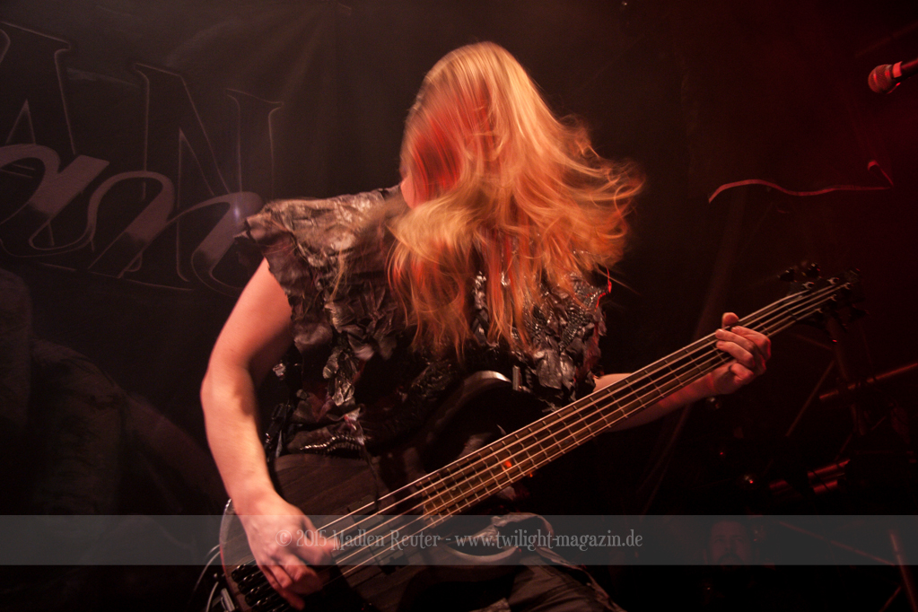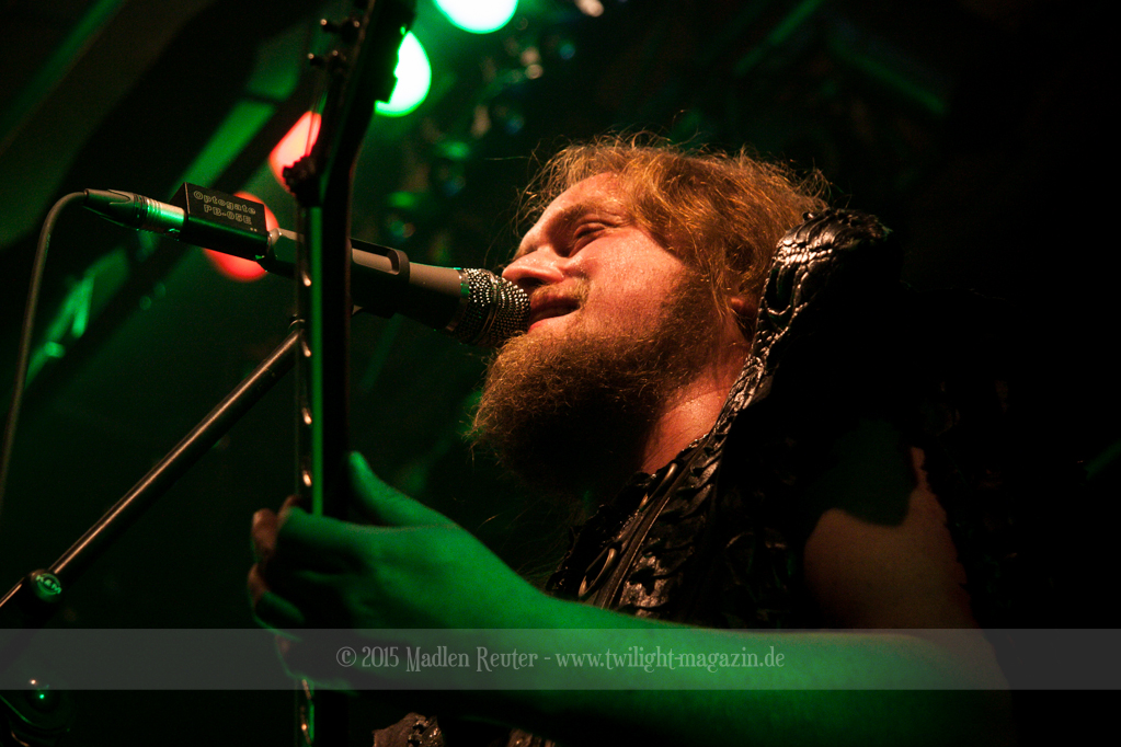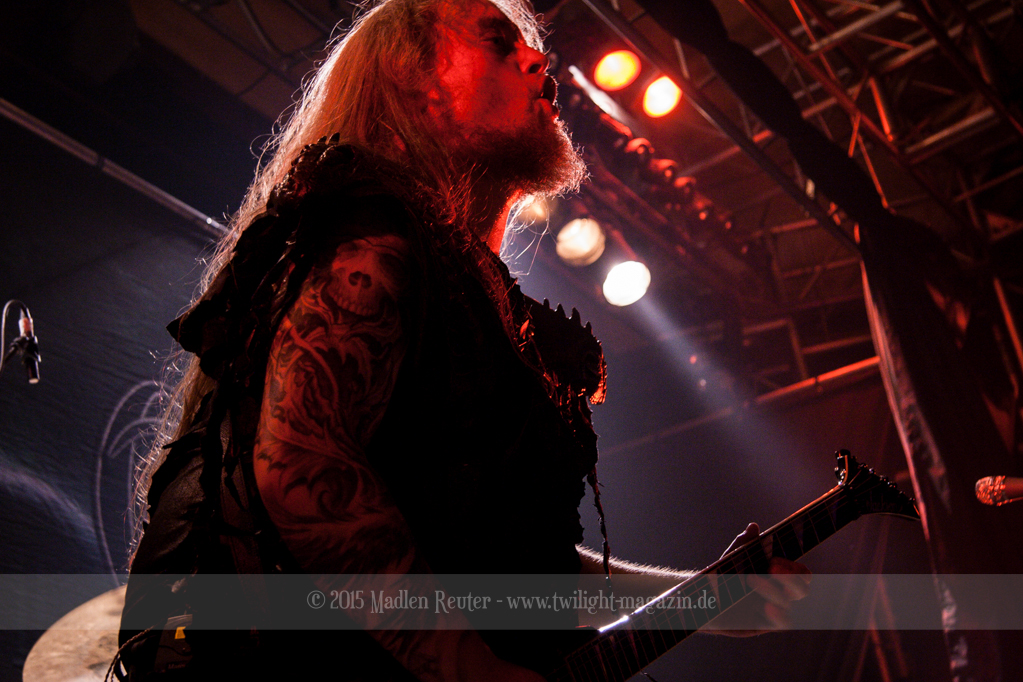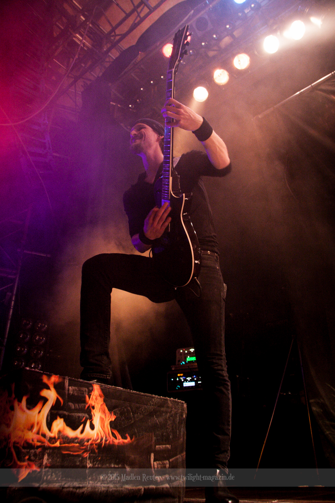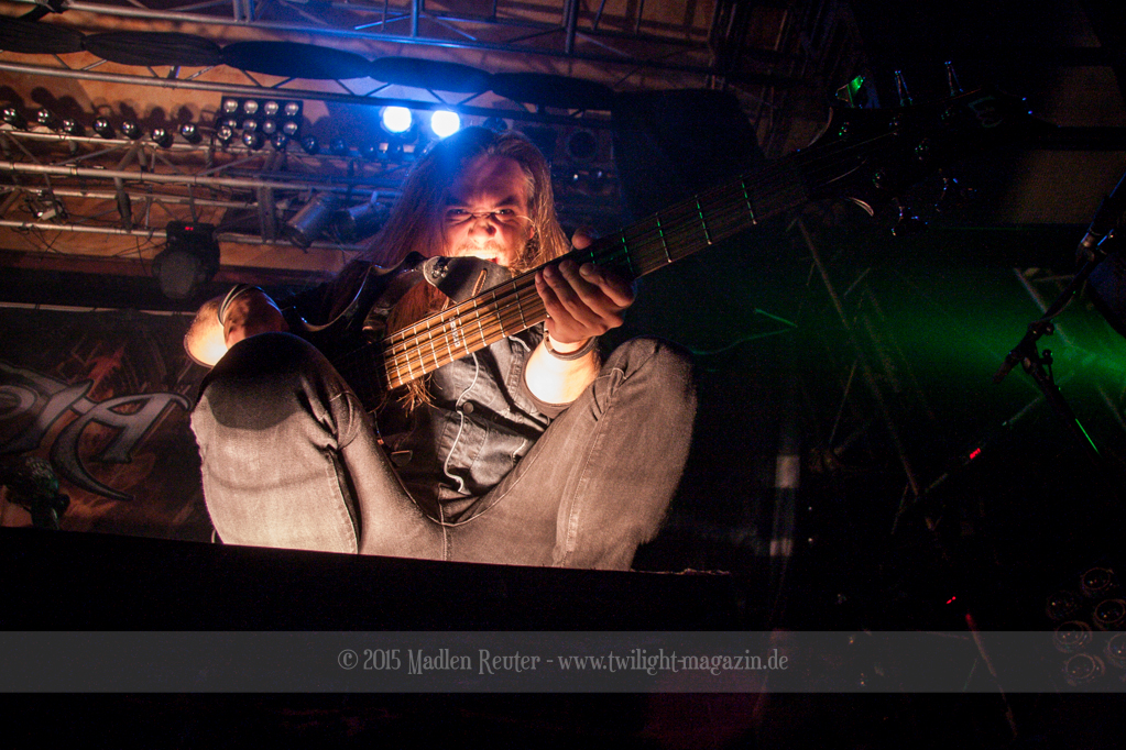 Nach kurzem Umbau wurde es dann Zeit für einen kurzen Ausflug nach Ravenhead. ORDEN OGAN übernahmen das Ruder und heizten den Anwesenden fleißig ein. Neben beeindruckenden Soli, fetten Riffs und brachialen Mitgröhlhymnen bestach die Band auch durch ihren Humor. Sänger Seeb erntet für seine lustigen Ansagen mehrfach Applaus. Auch sonst ist das Publikum fleißig dabei. Zwar brauchen die Besucher meist eine kurze Aufforderung, aber dann läuft es auch wie geschmiert. Die Setlist schien vor allem einen Schwerpunkt auf das neue Album („Ravenhead“, 2015) gesetzt zu haben. Grandios war es „Sorrow Is Your Tale“ live zu erleben, auch wenn mir „To New Shores Of Sadness“ eindeutig gefehlt hatte. Während vor der Bühne die Haare flogen, zockten Tobi und Seeb beeindruckende Soli auf ihren Gitarren. Dieses Teamspiel ist wirklich herrlich mit anzusehen. Und auch an diesem Abend fand sich wieder eine verirrte Seele, die mit lautstarken „Noch Ein Bier“-Rufen Aufmerksamkeit erhaschen wollte. Einzig richtige Reaktion vom Ordensoberhaupt: „Falsche Band man!“. Damit hatte sich die Geschichte für den restlichen Abend erledigt – Vielen Dank!