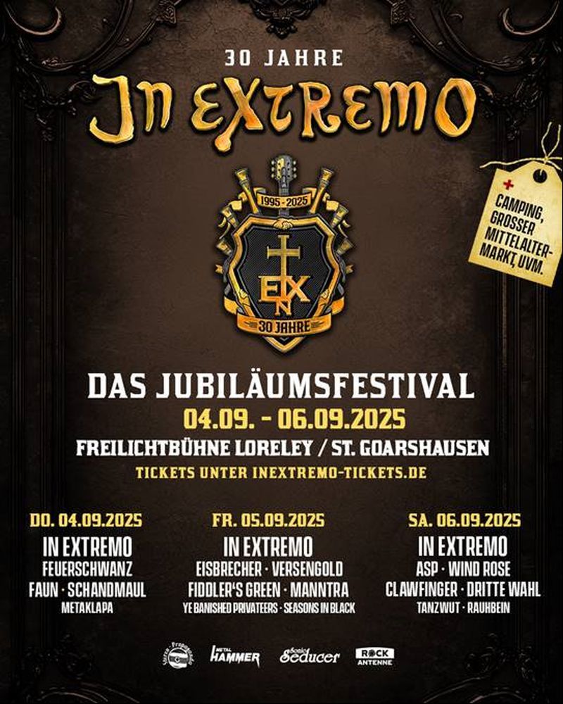 2025 jährt sich die Gründung von IN EXTREMO zum 30. Mal: Um diesen Anlass mit ihren Fans gebührend feiern zu können, veranstalten die sechs Musiker vom 04. bis zum 06.09.25 ein großes, dreitägiges Jubiläumsfestival auf der Freiluftbühne Loreley. Zahlreiche Freunde und musikalische Wegbegleiter werden mit ihren Auftritten die große Geburtstagsparty bereichern. IN EXTREMO werden an allen drei Tagen als Headliner die jeweiligen Abende beschließen.