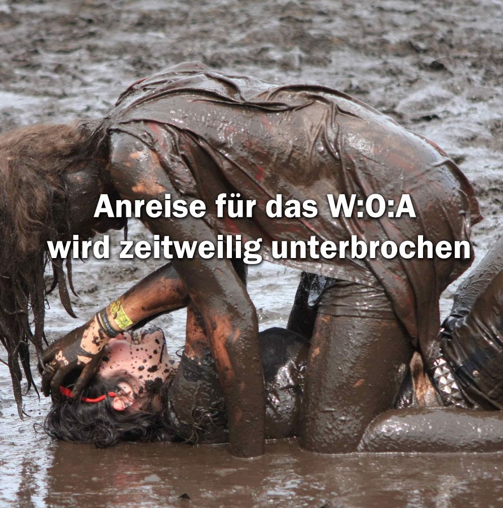Regen gibt es bei Festivals manchmal. Rain or shine. Aber nur selten so viel. Deshalb sind die Campingflächen aktuell nicht befahrbar. Wir müssen die Anreise zum W:O:A aus diesem Grund unterbrechen. Die Vorbereitungen für das Festival laufen aber wie geplant.