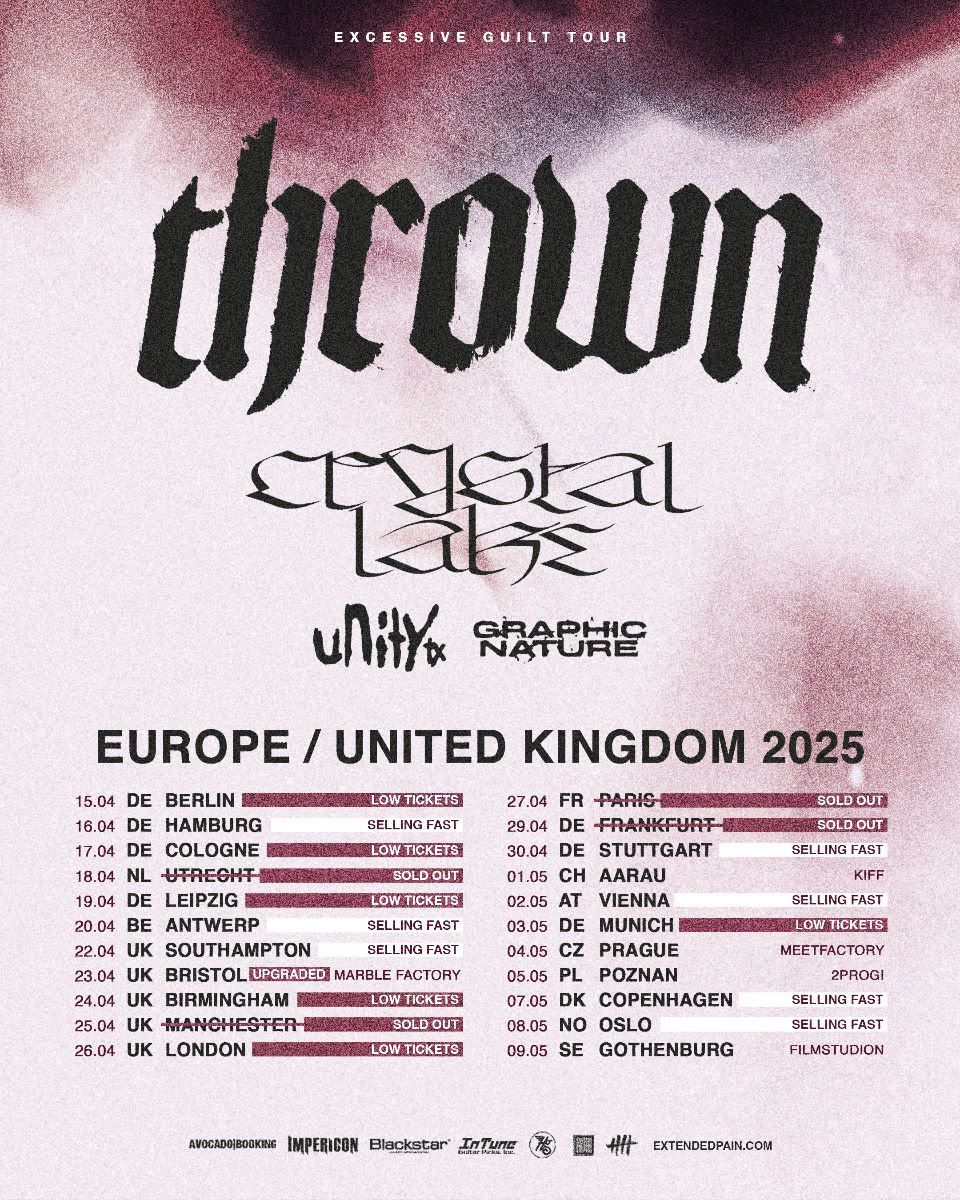 Es ist nicht mehr lange hin, bis Throwns „Excessive Guilt“ Europa / UK Tour beginnt. Die schwedische Band wird dabei von Crystal Lake, UnityTX und Graphic Nature unterstützt - ein Line-Up des besten Cutting-Edge-Metal des Jahres 2025. Die Tour beginnt am 15. April in Berlin, Deutschland und endet am 9. Mai in Göteborg, Schweden mit insgesamt 22 Stopps.
