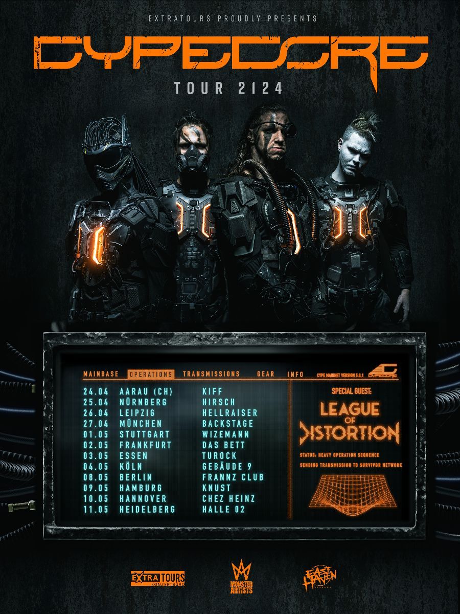 Über CYPERCORE: CYPECORE aus Mannheim gehören zu den innovativsten Metal-Bands Deutschlands. Die 2007 gegründete Band hat sich mit ihren vier Konzept Alben, einer neuen EP und sehr aufwendiger Bühnenshow einen angesehenen Status und eine treue Fangemeinde erspielt. Nachdem CYPECORE mit ihren cinematischen Musikvideos und 3,8 Millionen Aufrufen auf ihrem Youtube Channel weltweit beeindruckt haben, wurden gleichzeitig Newcomer Awards wie dem Metal Hammer Award abgeräumt und eine Platzierung in den Top 20 Album Charts erzielt. Es folgten Slots auf den großen Metal Festivals wie dem Summer Breeze Open Air, Wacken Open Air, Hellfest Open Air (FR), Reload Festival, Full Force. Mit einer Mischung aus kompromissloser Härte und Mitsing-Refrains erschaffen CYPECORE mit ihrer futuristische Liveshow und Musikvideos eine musikalische Blockbuster Atmosphäre die auch bei internationalem Publikum gut ankommt.