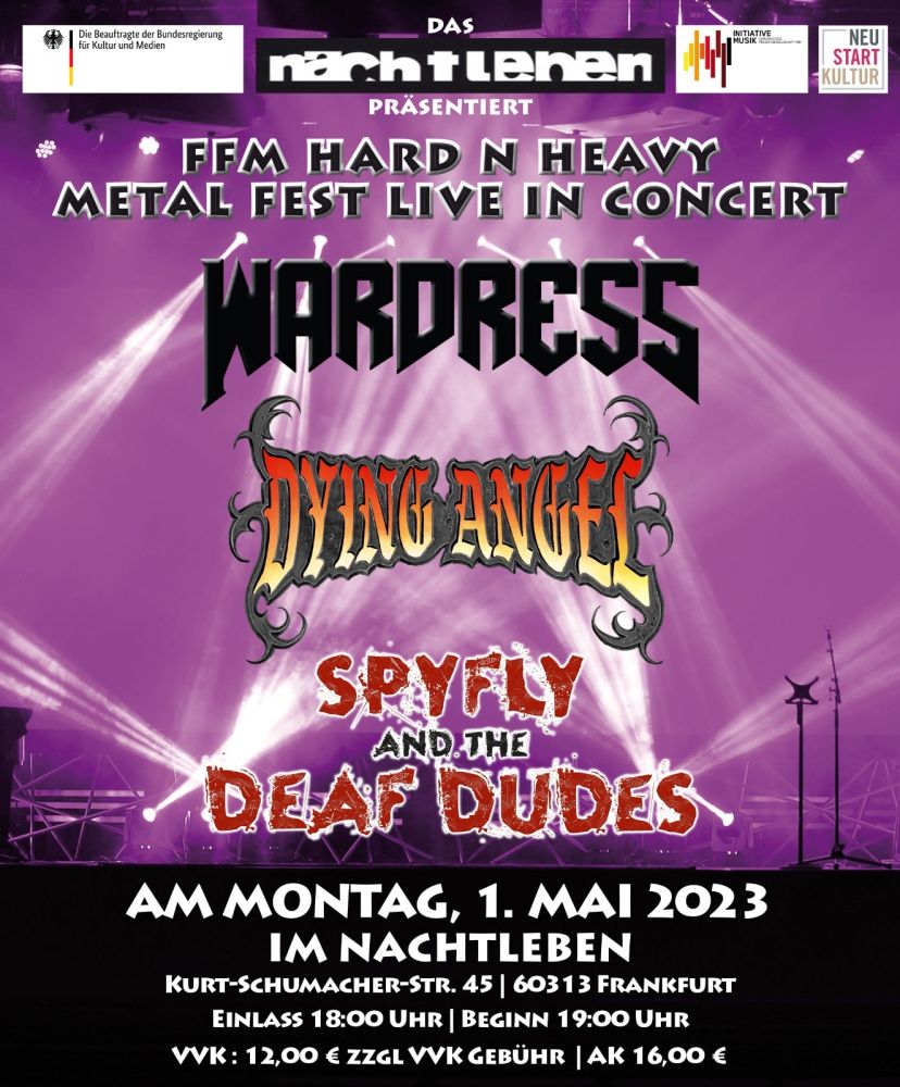 Featuring : WARDRESS Support: DYING ANGEL & SPYFLY AND THE DEAFDUDES (SFDD) Am Montag, den 1. Mai 2023 - Feiertag