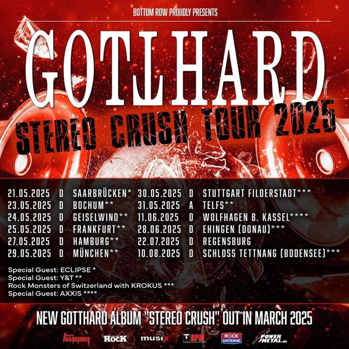 Der Albumveröffentlichung wird sich eine umfangreiche Europatournee anschließen, in deren Rahmen GOTTHARD u.a. auch sieben Konzerte mit Y&T als Special Guests sowie gemeinsam mit ihren Landsmännern KROKUS einige Shows in ihrer Heimat spielen werden. GOTTHARDs stetig weiterwachsenden Livekalender sowie Ticketinfos findet man unten! Alle Fans können sich bei der „Stereo Crush Tour 25“ auf eine Setlist freuen, die neue Energie und unsterbliche Hymnen perfekt vereint. Natürlich dürfen auch die Klassiker der Bandgeschichte nicht fehlen – von „Heaven“ bis „Anytime Anywhere“ und „Feel What I Feel“.