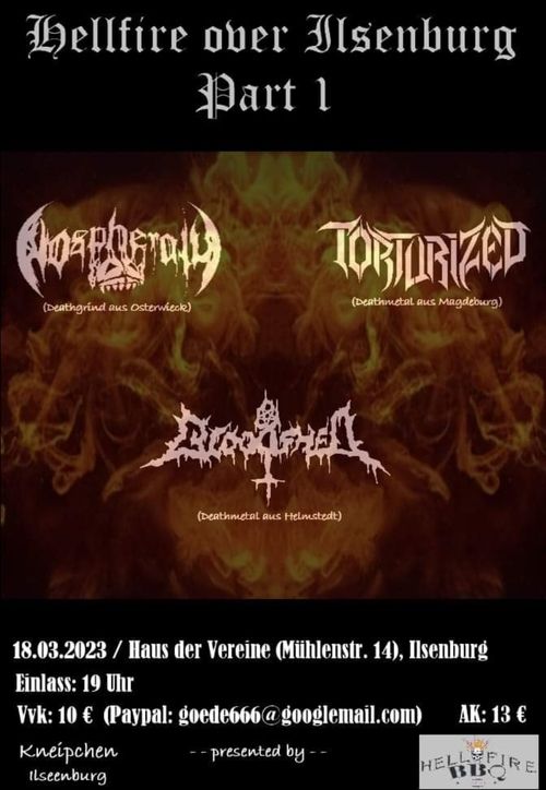Im Harzstädtchen Ilsenburg am Fuße des Brockens werden TORTURIZED aus Magdeburg, BLOODSHED aus Helmstedt und NOSPHERATU aus Osterwieck drei Bands aufspielen, die sich nicht erst in den letzten Jahren einen Ruf im Death Metal- und Deathgrind-Underground, teilweise über die Landesgrenzen Niedersachsens und Sachsen-Anhalts erspielt haben.