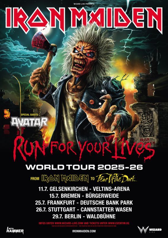 Die Tourdaten finden sich unten. Tickets gibt es ab Mittwoch, 25. September, 10 Uhr im exklusiven Online Presale bei CTS Eventim unter https://www.eventim.de/artist/iron-maiden/. Der allgemeine Vorverkauf beginnt am Freitag, 27. September um 10 Uhr.
