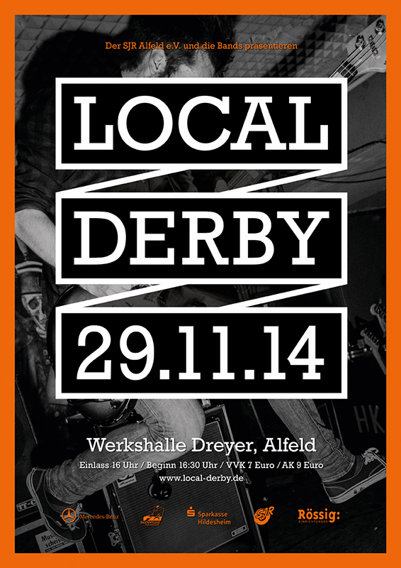 19 Jahre nach der Gründung ist das Local Derby längst zur Institution der lokalen Musikszene geworden. Was einst als Sommer-Open-Air im Garten des Jugendzentrums Treff begann, entwickelte sich im Laufe der Jahre immer weiter, erfand sich neu und ist auch anno 2014 nicht aus dem Alfelder Musikbetrieb wegzudenken. Seit jeher organisieren die Alfelder Bands – unterstützt durch SJR Alfeld e.V. und die Jugendpflege – dieses Festival. In diesem Jahr stehen acht Bands unterschiedlichster Genres auf der Bühne. Neben alten Bekannten und anerkannten Größen sind auch vier völlig neue Bands dabei.