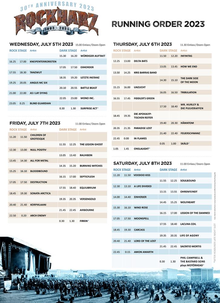 Home News Running Order Rockharz 2023 von Marcel Hübner • 22. Juni 2023 • Running Order Rockharz 2023 Running Order Rockharz 2023https://www.rockharz-festival.com/bands/running-order-2