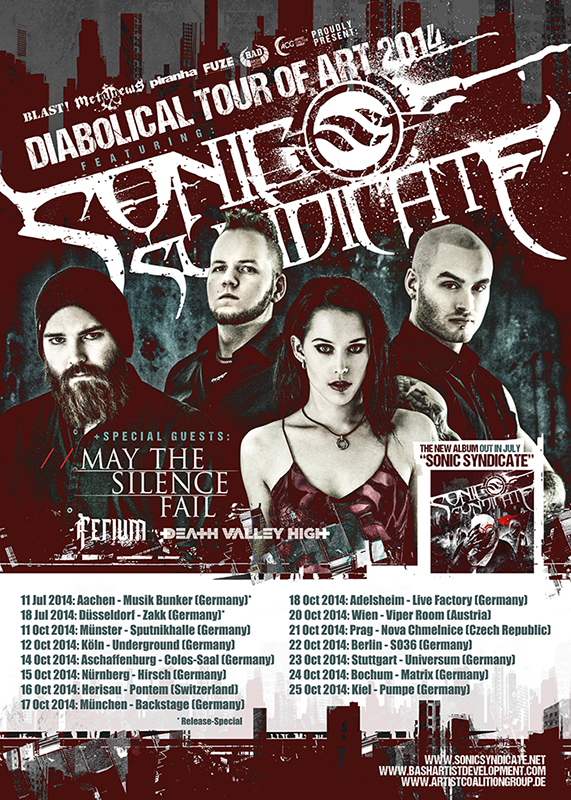Als Co-Headliner konnten Sonic Syndicate die Stuttgarter Band MAY THE SILENCE FAIL gewinnen, die sie auf dem letztjährigen SUMMER BREEZE gesehen und überzeugt hatten. Die Mädels und Jungs von MAY THE SILENCE FAIL bringen am 10. Oktober ihren ersten Longplayer Of Hope And Aspiration in die Läden. Mit dabei sind FERIUM aus Israel, die dieses Jahr auch Ihr erstes Full-length Album Reflections rausgebracht haben. Und last but not least DEATH VALLEY HIGH aus USA, die sich mit dem Album positive euth 2013 wieder zurückmeldeten.