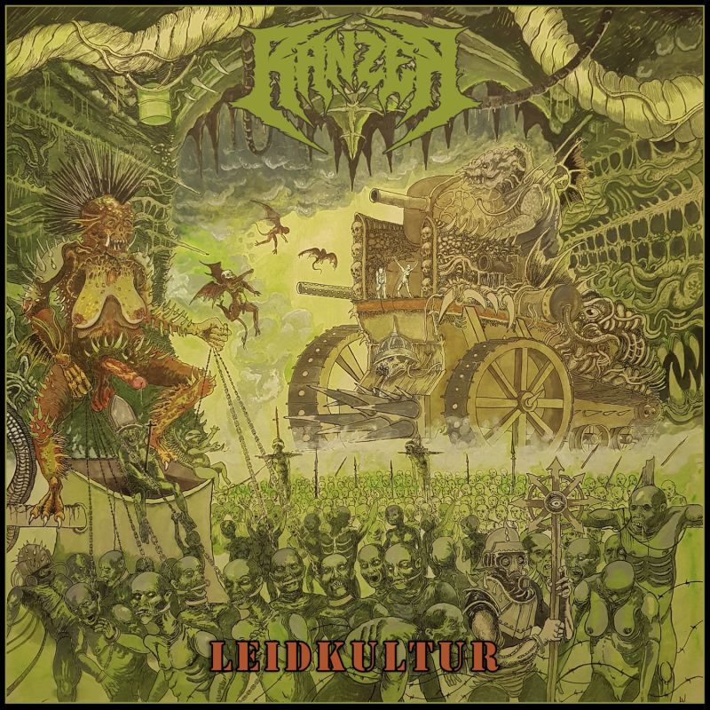 Rein musikalisch geht man den eingeschlagenen Weg konsequent weiter. Hatte das Demo “Demophobie” 5 Songs bei einer Länge von 17 Minuten, so ist man mit “Leidkultur” in bester Slayer- und Wolfbrigade-Tradition bei 31 Minuten und 10 Tracks angekommen. Einen Abzug in der B-Note muss es leider vorweg für den Umstand geben, dass man das wiederum sehr ansprechende Artwork von Thomas “Necromaniac” Westphal für die Tape-Version “gestutzt” hat. Da hätte man sich etwas mehr einfallen lassen können und ja, allein für das Cover lohnt schon die Anschaffung der Vinylversion! Musikalisch spuckt man einmal mehr giftig links-grüne-siffige Galle. Die derben deutschen Texte sorgen wiederum für eine unmissverständliche Ansprache, klare Kante und Haltung des nordhessischen Fischerei-Vereins.