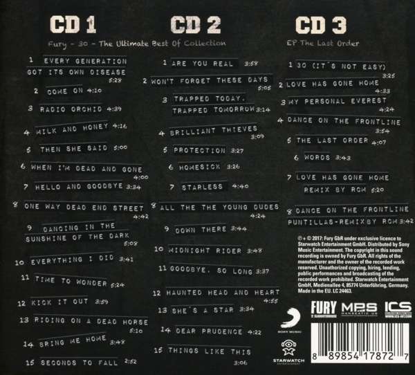 Auf drei CDs (optional auch mit zusätzlicher DVD) gibt es einen Querschnitt durch alle Schaffensphasen der Band, die seinerzeit durch die Clubs der Region tingelte bevor es in die großen Hallen ging und sogar der internationale Erfolg an die Tür klopfte. Der Redakteur in der HiAZ verglich das Konzert vom Freitag mit einem Klassentreffen. Und während sich wohl vor allem die Mittdreißiger und Vierziger über die musikalische Zeitreise in ihre Jugendjahre freuen dürften, laden FURY wohl auch junge und ganz neue Fans zu dem Klassentreffen, denn Songs wie „Kick it out“, „Radio Orchid“, „Dancing in the sunshine of the dark“, „Time to Wonder“ oder „Won’t forget these days“ dürften auch jüngere Rockfans nicht unberührt lassen. Nicht zuletzt durch Wingenfelders unverwechselbare Stimme werden die Songs auch 2017 zu einem Felsen im Strom der Internetmusik. Neben zwei CDs voller Hits und Höhepunkte gibt es auf der dritten CD die „The Last Order“ EP, die zum Teil Remixe enthält.