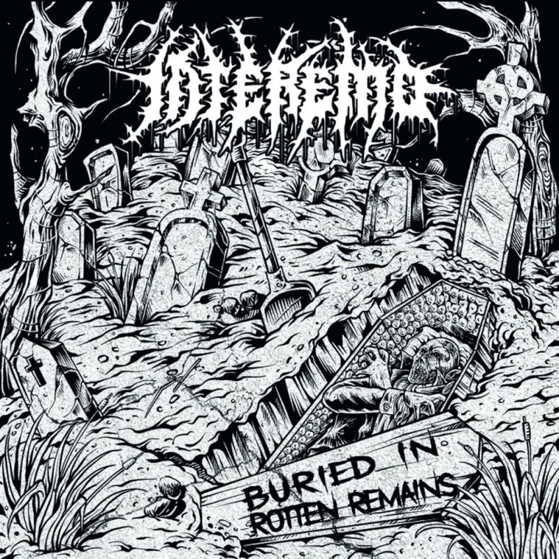 Das junge Trio aus Malmö frönt auf ihrem Debüt „Burried n Rotten Remains“ mit voller Hingabe den alten Helden der ersten Well des Schwedentods: DISMEMBER, EDGE OF SANITY, GRAVE, ENTOMBED. Angesehen vom lediglich sechs Sekunden langen Wutausbruch „Decapitation“ rangieren die Songs i.d.R. um die drei Minuten, wobei „Rotten Corpse“ am Ende mit guten sechs Minuten den längsten Song darstellt. Das Trio kommt also immer schnell auf den Punkt, versucht dabei jedoch keine Geschwindigkeitsrekorde zu brechen. Im Gegenteil, das Hauptaugenmerk liegt auf dem zermalmenden Groove, den man von Bands wie ASPHYX oder BOLT THROWER kennt. Insofern gibt einem der Opener „Twisted and Abuse“ bereits einen aufschlussreichen Einblick in die folgenden ca. 47 Minuten Old School Death Metal. „Severed“ entpuppt sich dabei als eine wahre Groove Machine, die aber dennoch auch gerne mal das Tempo etwas anzieht. Und so geht es mit „Stupid As It Sounds“ auch flott weiter, bevor mit „Mass Extinction“ eine echte Death Metal Granate abgefeuert wird. Die sägenden HM2-Äxte werden immer wieder von gellenden Sologitarren durchzogen, was dem Ganzen einen echten 90er Jahre Flair verpasst. Und genau dieses Flair wird auch vom Sound und von dem schwarz-weißen Coverartwork des Albums geatmet. Besonders gefällt mir an demDebüt des Trios, dass wir es hier ausnahmsweise mal nicht mit älteren Herren zu tun haben, die in ihrer zweiten Lebenshälfte ihre Band wieder aufleben lassen. Nein, mit Harry, Milo und Filip betreten drei gänzlich unbeschriebene Blätter die Bühne und liefern ein Debüt ab, welches sich hinter den Alben der Platzhirsche nicht zu verstecken braucht. Toller Einstieg. Man darf gespannt sein, was es von INTÉREMO in Zukunft noch zu hören gibt.